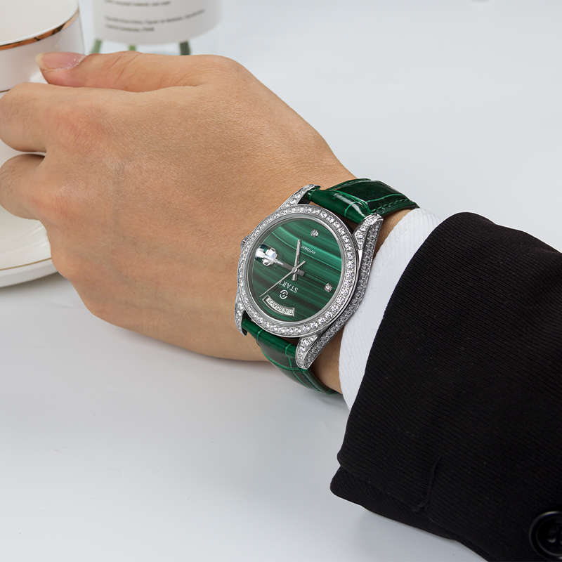 Đặc điểm: Mặt số malachit tự nhiên, vỏ nạm kim cương, dạ quang,ngày,Tuần,kim giờ dạ quang