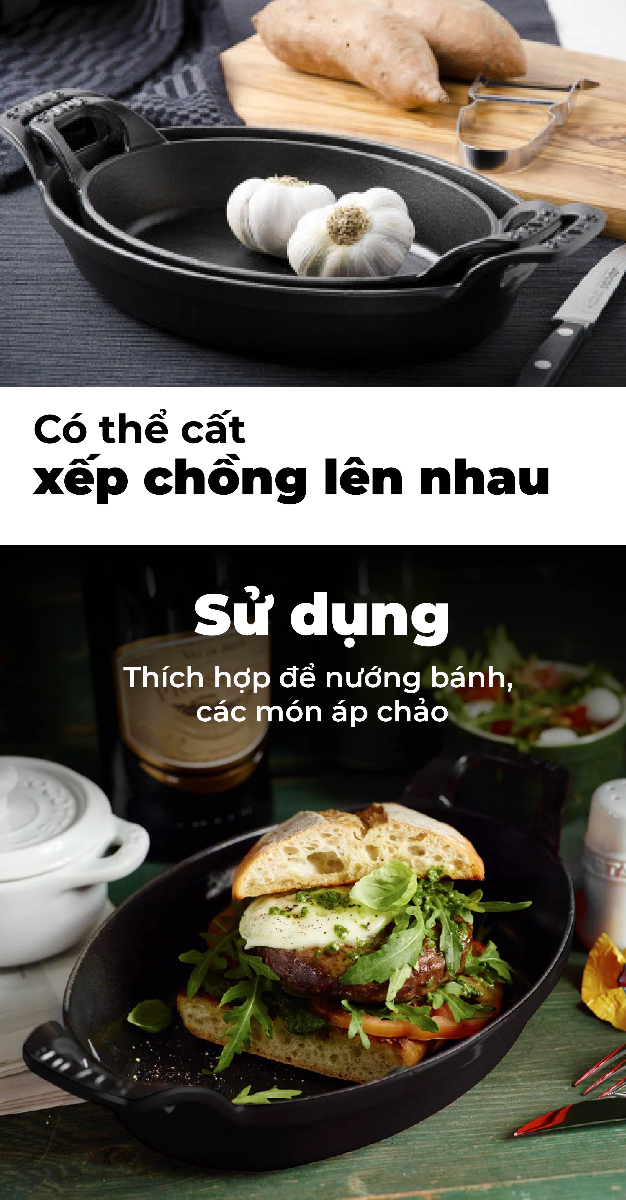 Sản phẩm khay gang oval STAUB màu đen từ thương hiệu STAUB nổi tiếng tại Pháp, mang đến trải nghiệm nấu nướng mới mẻ khi khay có thể dùng để nướng bánh, áp chảo thực phẩm, kể cả tạo điểm nh...