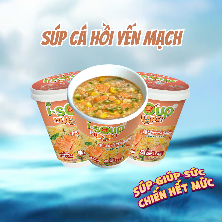 - Thật: Topping tươi nguyên miếng và nước dùng đậm chất nấu từ nguyên liệu thật giúp thỏa mãn vị NGON thông qua vị giác, thị giác và khứu giác. Bạn dễ dàng nhìn thấy và tận hưởng các nguyên liệu thật và tươi ngon cá hồi, măng tây, cà rốt, bắp và yến mạch Nhanh: Tỉnh táo tức thì với 1 ngụm súp ấm với trải nghiệm no bụng ấm lòng chỉ với 4 phút chuẩn bị I.SOUP HUUPS! sẽ sưởi ấm cho chiếc bụng “ọt ẹt” của bạn vào buổi sáng, buối xế, buổi khuya, trước khi tập gym, chạy bộ, những ngày bị deadline dí sấp mặt hay chỉ là “hôm lười” và muốn danh thời gian chữa lành cho bản thân. I.SOUP HUUPS! được làm từ công nghệ sấy thăng hoa tiên tiến từ Nhật Bản để giúp giữ trọn vị, chất dinh dưỡng, độ tươi của nguồn nguyên liệu đầu vào đạt chuẩn an toàn thực phẩm thế giới như FDA, BRICS ISOUP HUUPS! hiện có 5 vị: