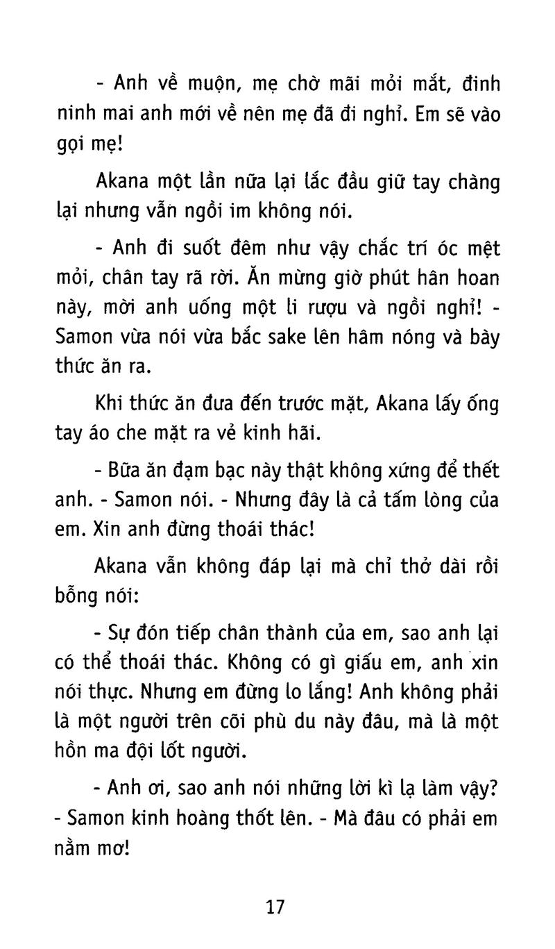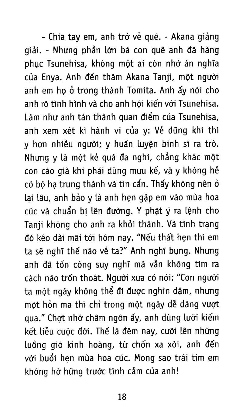 “Đêm vẫn tối. Trên bầu trời, ánh trăng mờ nhạt. Gió thổi lạnh buốt. Cửa buồng Shotaro mở toang mà người thì mất tích. Phải chăng hắn ẩn náu ở bên trong? Hikoroku nhảy vội