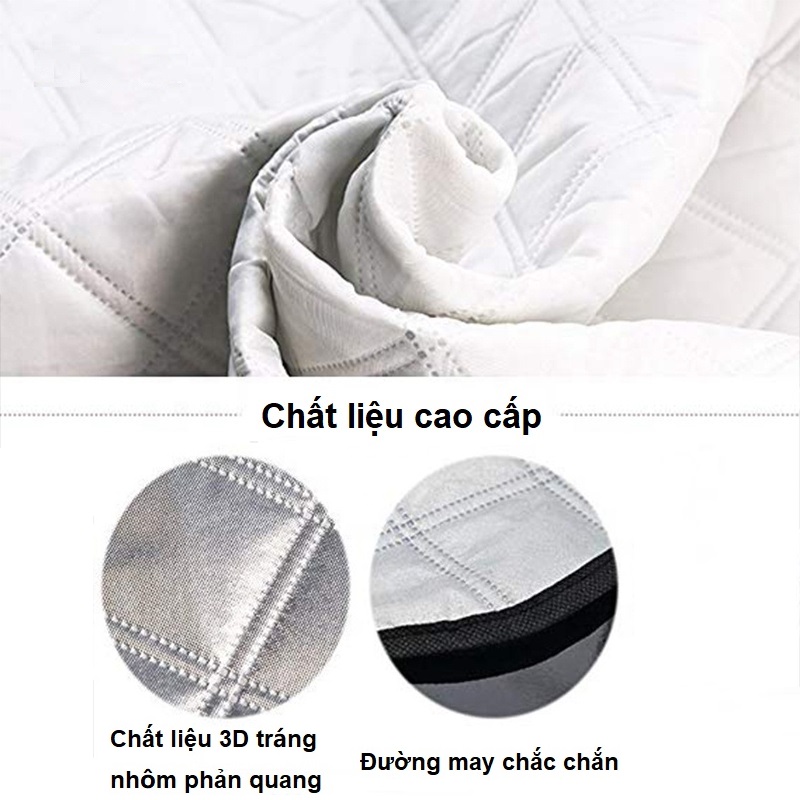 - Lớp vải nhôm PE phản quang chống thấm: Đóng vai trò là lớp màng chắn đầu tiên để phản xạ lại tia nắng mặt trời chiếu tới và ngăn chặn quá trình hấp thụ nhiệt lượng, bức xạ vào bên trong xe.