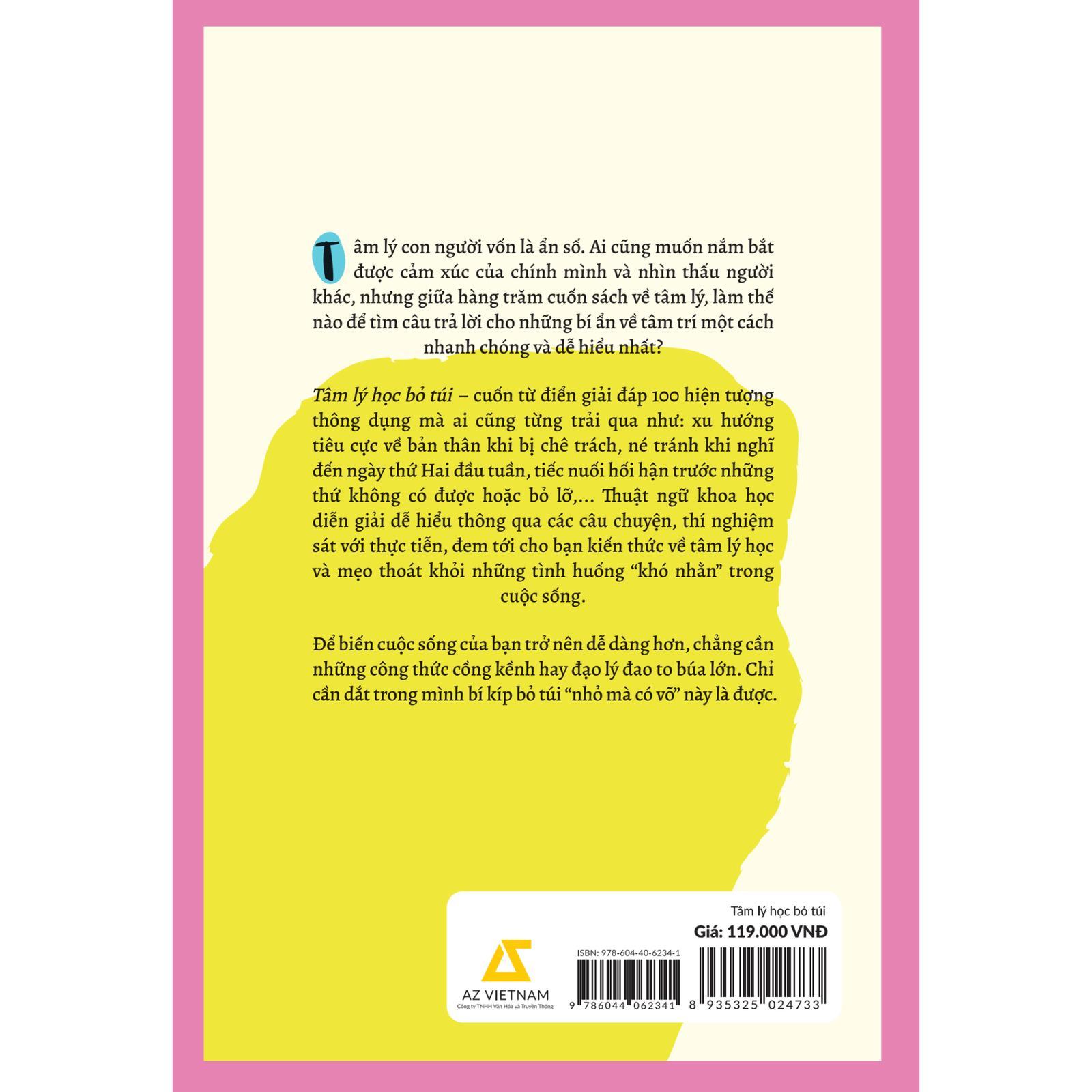 Tâm lý học bỏ túi – cuốn từ điển giải đáp 100 hiện tượng thông dụng mà ai cũng từng trải qua như: xu hướng tiêu cực về bản thân khi bị chê trách, né tránh khi nghĩ đến ngày thứ Hai đầu tuần, tiếc nuối hối hận trước những thứ không có được hoặc bỏ lỡ,...