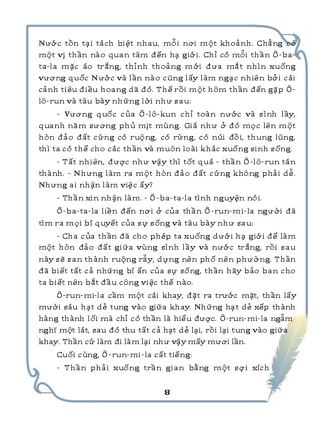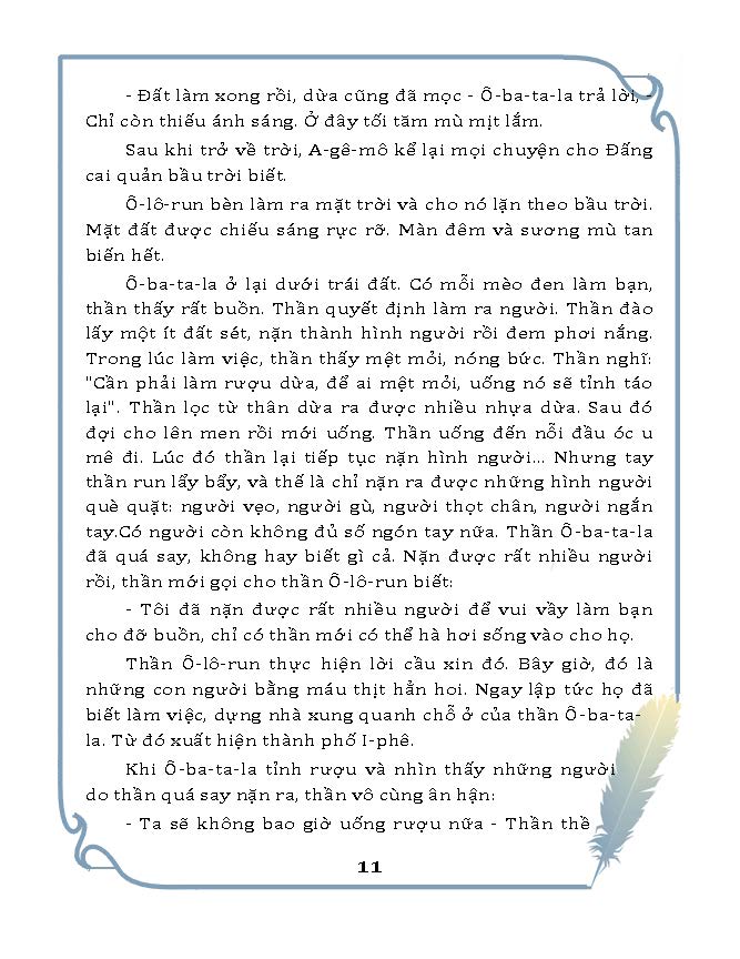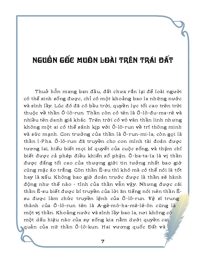 Cuốn sách là một hành trình khám phá kỳ thú qua những câu chuyện thần thoại của các dân tộc trên thế giới. Từ những truyền thuyết cổ xưa về sự hình thành vũ trụ đến những câu chuyện kỳ ảo về các vị thần và anh hùng, cuốn sách không chỉ mang đến cho độc giả những kiến thức bổ ích về văn hóa, tín ngưỡng của nhân loại mà còn là một nguồn cảm hứng vô tận. Với lối kể chuyện sinh động, hình ảnh giàu chất thơ, cuốn sách là một tác phẩm nghệ thuật đích thực, khơi gợi trí tưởng tượng và sáng tạo của người đọc.