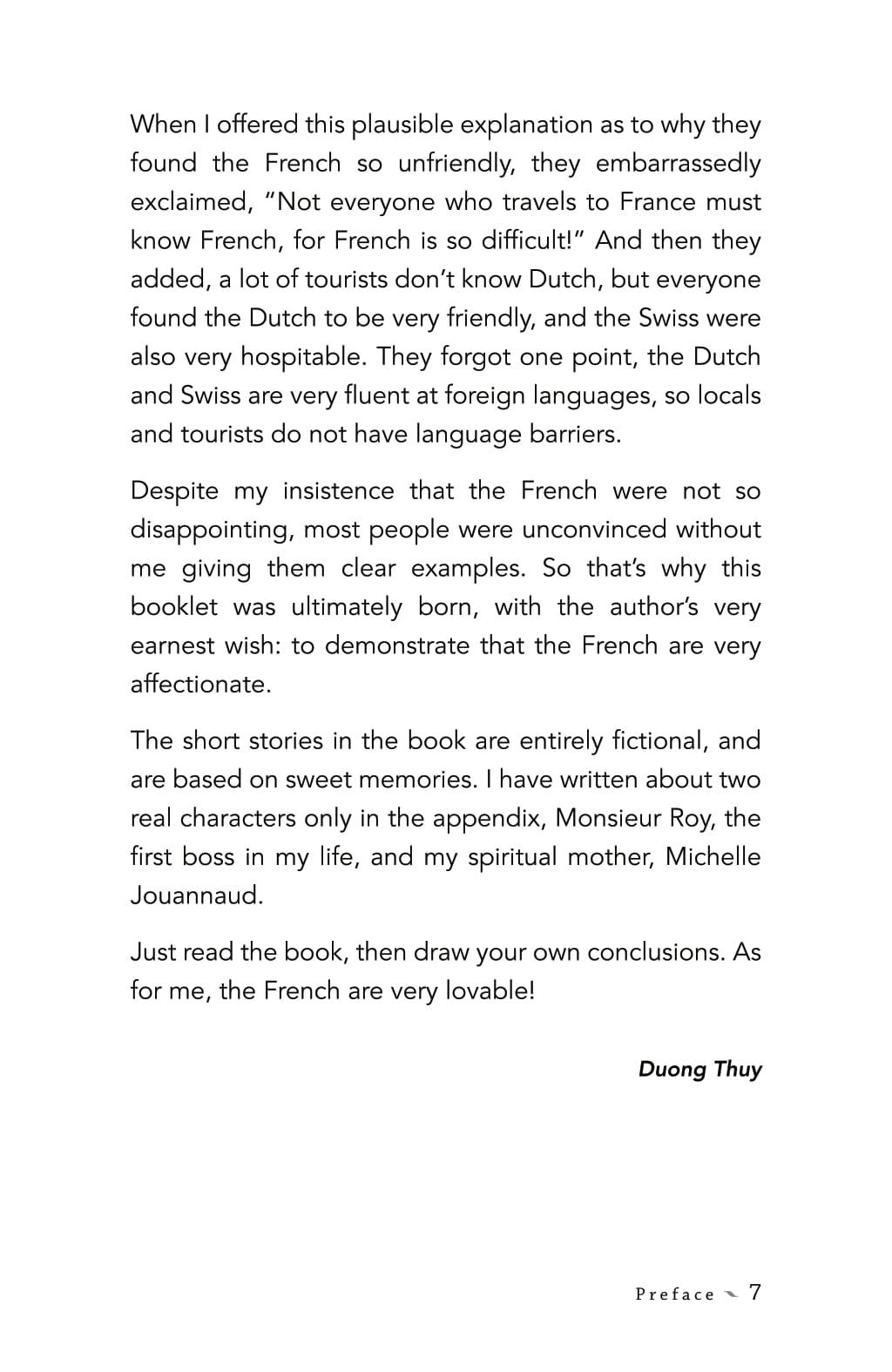 "France, for me, was not a simple country to visit. It was a place that always emotionally touched me whenever I returned, for I was able to speak the language I had learned during my childhood years, and to hug the dear French people who saw me as a family member. I had a love for France which I could not describe. I only knew that there was an invisible cord connecting my heart to that beautiful land. And, of course, the French people I've known for decades have a deep-down dear love for me, far beyond a normal friendship." - Duong Thuy