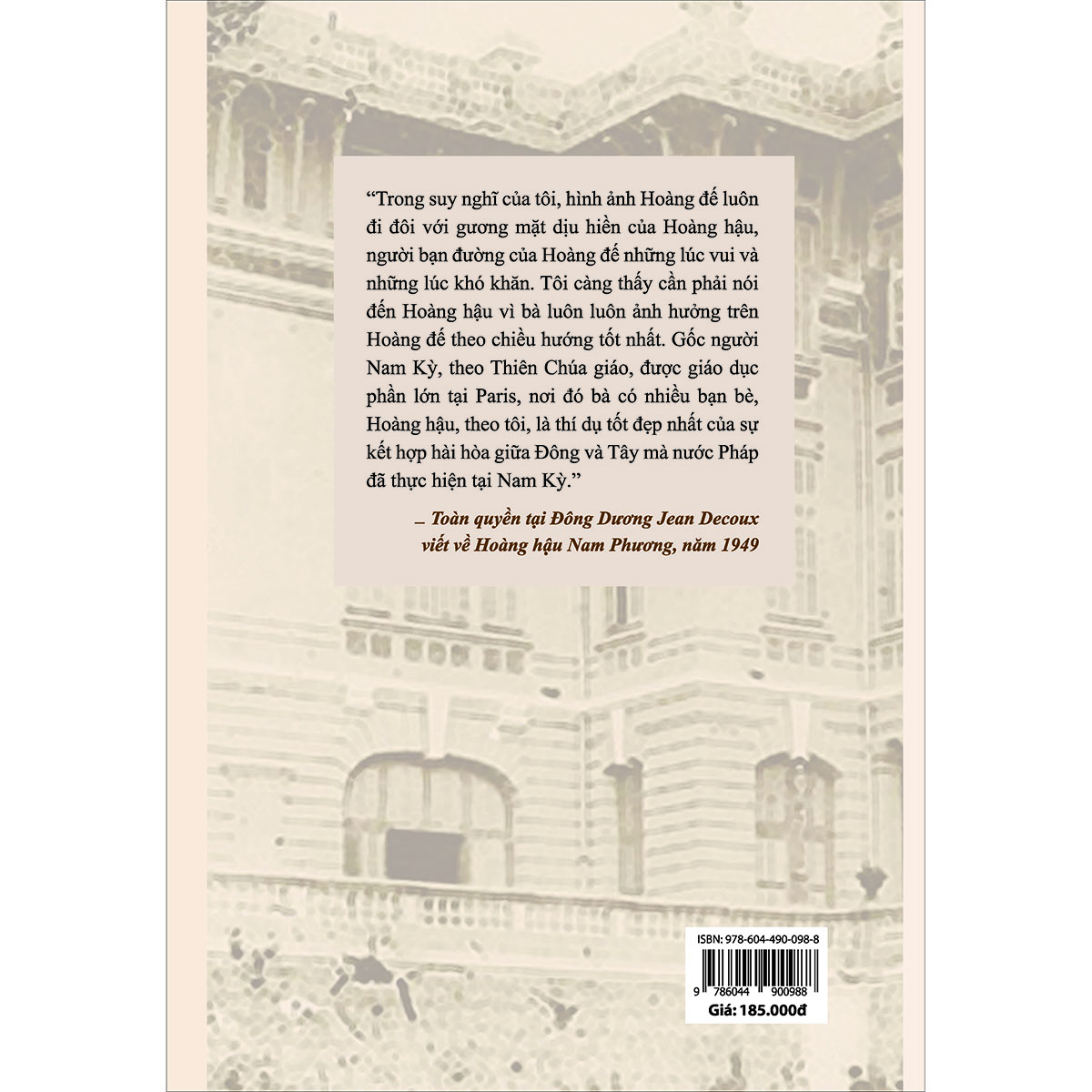 “Trong suy nghĩ của tôi, hình ảnh Hoàng đế luôn đi đôi với gương mặt dịu hiền của Hoàng hậu, người bạn đường của Hoàng đế những lúc vui và những lúc khó khăn. Tôi càng thấy cần phải nói đến Hoàng hậu vì bà luôn luôn ảnh hưởng trên Hoàng đế theo chiều hướng tốt nhất. Gốc người Nam Kỳ, theo Thiên Chúa giáo, được giáo dục phần lớn tại Paris, nơi đó bà có nhiều bạn bè, Hoàng hậu, theo tôi, là thí dụ tốt đẹp nhất của sự kết hợp hài hòa giữa Đông và Tây mà nước Pháp đã thực hiện tại Nam Kỳ.” – Toàn quyền tại Đông Dương Jean Decoux, năm 1949