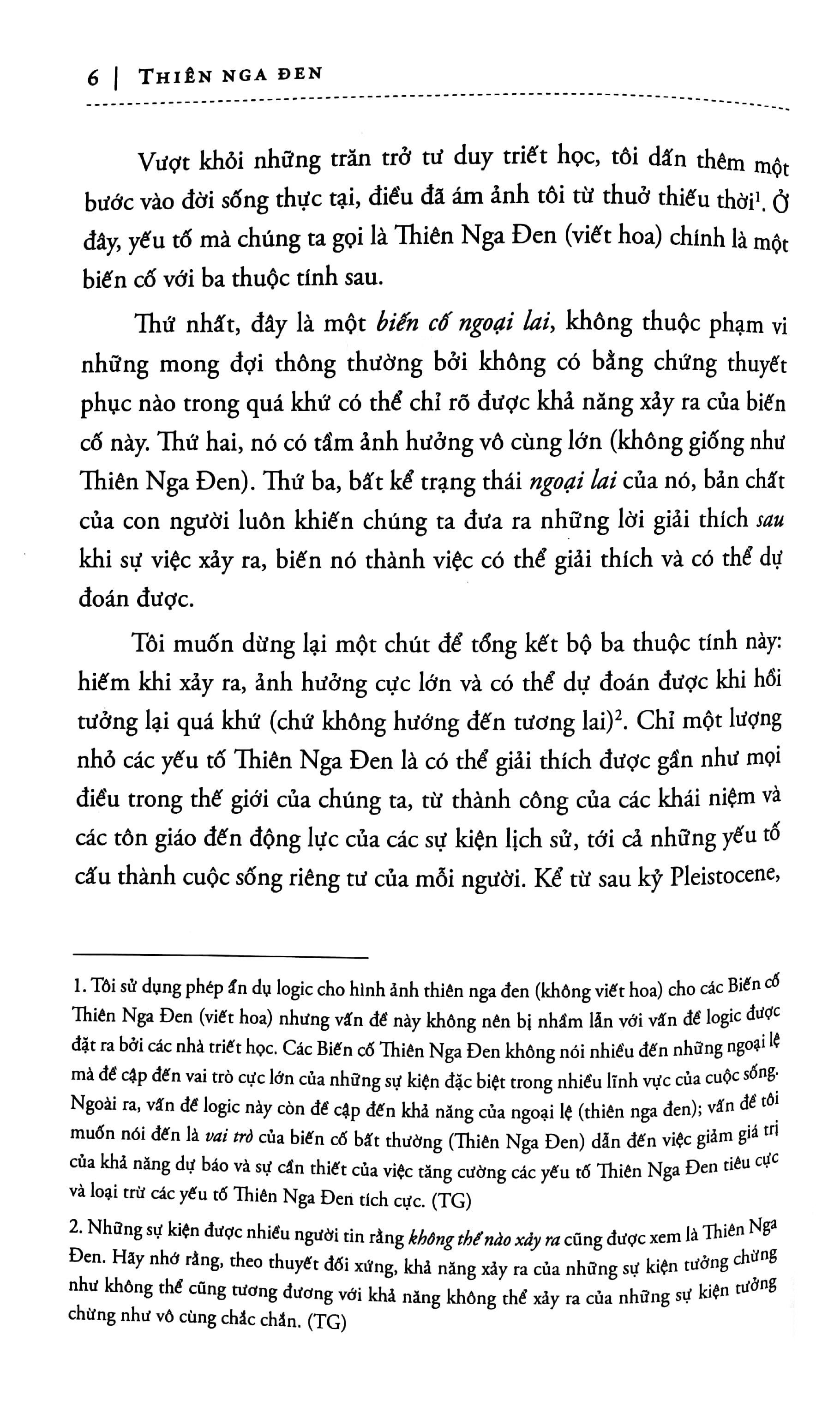 Chúng ta không biết rất nhiều thứ nhưng lại hành động như thể mình có khả năng dự đoán được mọi điều. Và trong cuốn sách này, tác giả Nassim Nicholas Taleb đã đi sâu vào khai thác những sai lầm của tư tưởng cố hữu ấy. Theo ông, “thiên nga đen” là một biến cố tưởng chừng như không thể xảy ra với ba đặc điểm chính: không thể dự đoán, có tác động nặng nề và sau khi nó xảy ra, người ta lại dựng lên một lời giải thích để khiến nó trở nên ít ngẫu nhiên hơn, dễ dự đoán hơn so với bản chất thật của nó. Thành công đáng kinh ngạc của Facebook có thể được coi là một “thiên nga đen”, việc nước Anh rời khỏi Liên minh châu u cũng là một “thiên nga đen”. Thiên nga đen luôn ẩn hiện trong mọi mặt của cuộc sống với những tác động khó lường, theo cả hướng tiêu cực và tích cực.