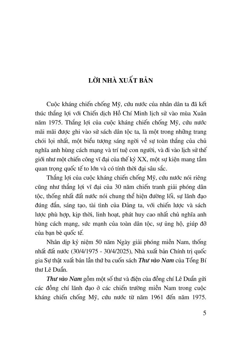 Thư vào Nam gồm một số thư và điện của đồng chí Lê Duẩn gửi các đồng chí lãnh đạo ở các chiến trường miền Nam trong cuộc kháng chiến chống Mỹ, cứu nước từ năm 1961 đến năm 1975. Nội dung cuốn sách phản ánh sinh động thực tiễn cách mạng và sự lãnh đạo tài tình, sâu sát của Trung ương Đảng đối với cách mạng miền Nam, từ thực tiễn chỉ đạo các chiến trường, từ nhận định tình hình đến đề ra chủ trương, biện pháp và phương pháp cách mạng, đã phát triển hết sức phong phú về đường lối chiến tranh cách mạng Việt Nam, đặc biệt là lý luận của việc thực hiện hai mặt đấu tranh chính trị và đấu tranh vũ trang, của sự kết hợp hai mặt đấu tranh đó, với phương châm “hai chân”, “ba mũi”, “ba vùng” luôn nắm vững tư tưởng chiến lược tiến công và mục đích chiến lược của cách mạng Việt Nam, cũng như việc xây dựng thực lực cách mạng trên từng chiến trường qua các thời kỳ khác nhau, góp phần cùng toàn Đảng, toàn quân, toàn dân ta đánh cho Mỹ cút, đánh cho ngụy nhào, tiến lên giành thắng lợi cuối cùng.