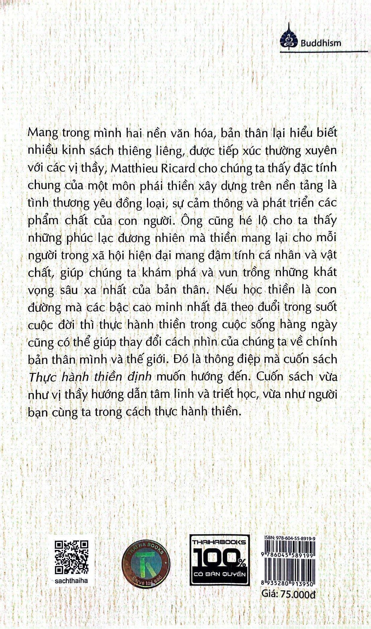 Mang trong m.ình hai nền văn hóa, bản thân lại có kinh nghiệm của người tu sỹ, hiểu biết những kinh sách thiêng liêng, được thường xuyên tiếp xúc với các vị thầy, Mathieu Ricard cho chúng ta thấy đặc tính chung của một môn phái thiền xây dựng trên nền tảng là tình thương yêu đồng loại, sự cảm thông và phát triển các phẩm chất của con người. Ông cũng hé lộ cho ta thấy những phúc lạc đương nhiên mà thiền có khả năng mang lại cho mỗi người trong một xã hội hiện tại vốn mang đậm tính cá nhân và vật chất, giúp chúng ta khám phá và vun trồng những khát vọng sâu xa nhất của bản thân.