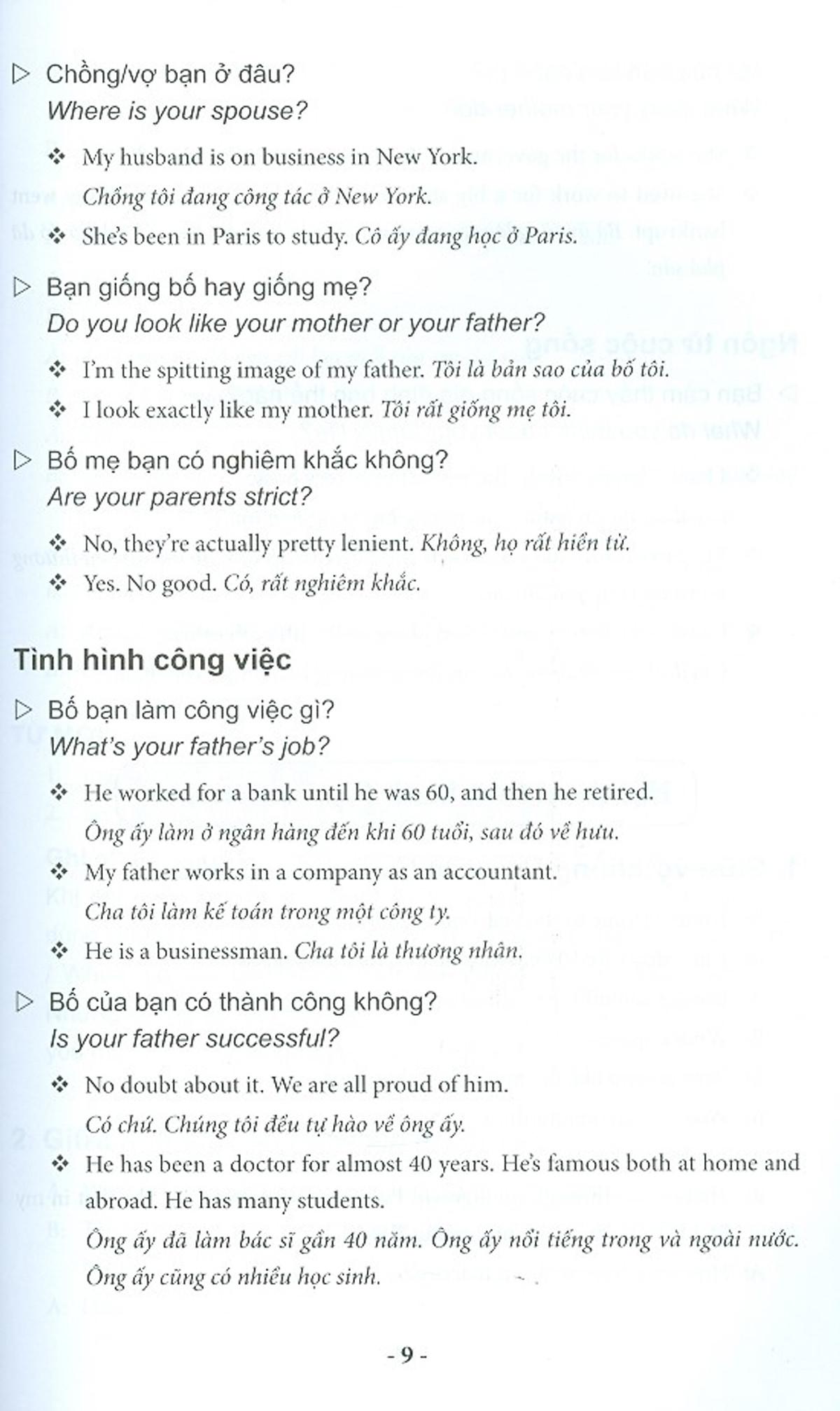Bộ sách này sẽ là tài liệu hữu ích cho bạn. Bộ sách gồm 2 tập. Tập 1 bao gồm các chủ đề đàm thoại về cuộc sống gia đình, tình yêu và hôn nhân, giao tiếp xã hội, và cuộc sống sinh hoạt hằng ngày. Các chủ đề đàm thoại ở Tập 2 đi sâu vào các lĩnh vực như giao thông, dịch vụ khách sạn, học tập và giải trí, thể thao, du lịch, nghề nghiệp, và thương mại.