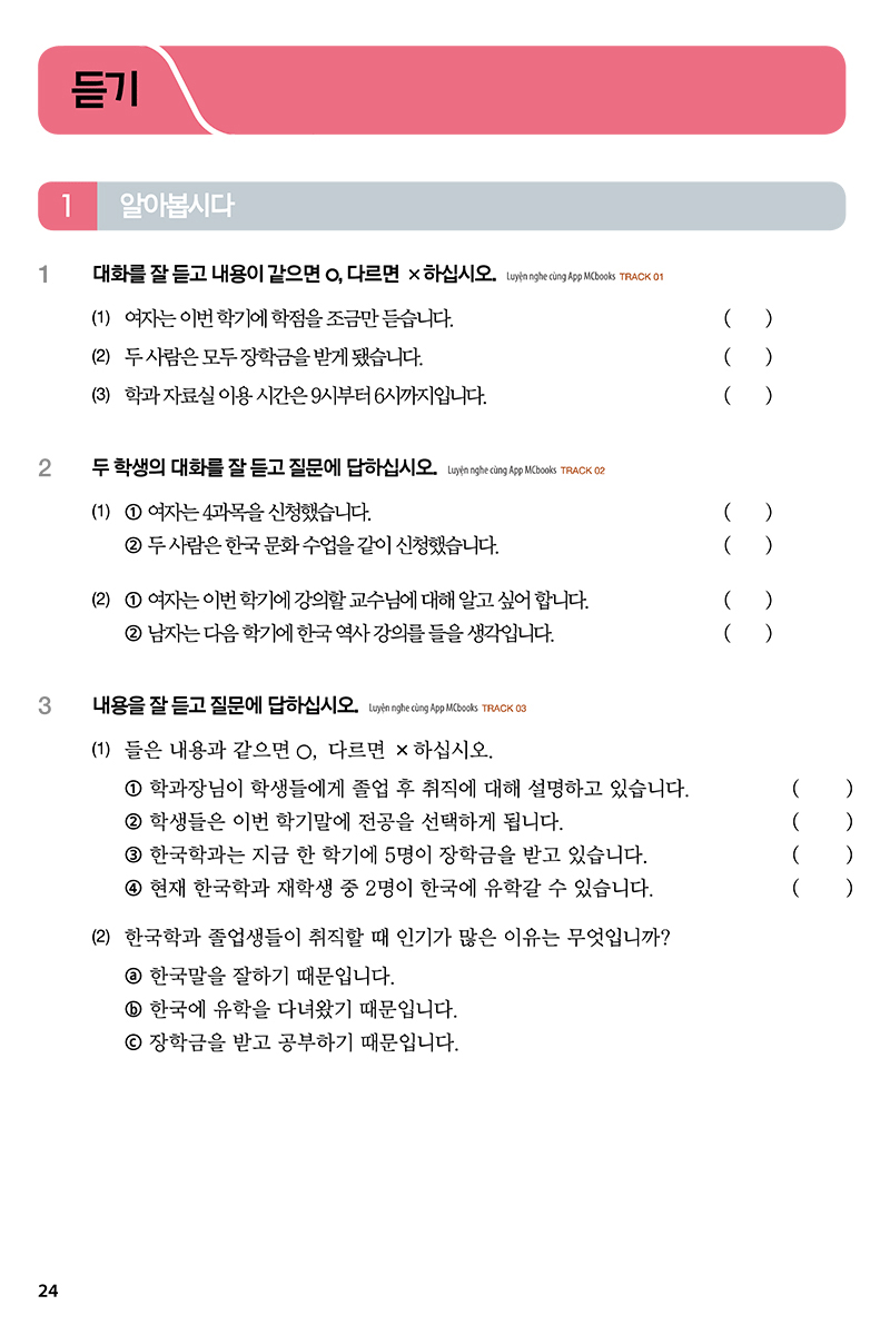 - Nội dung APP MCBooks Cấu tạo của App thông minh, khoa học, chia thành 3 phần rõ ràng: Phần bài học: File luyện nghe tương ứng với các track ghi trong giáo trình. Phần bài tập: Gồm nhiều dạng bài đa dạng, cấu trúc bám sát theo các bài học trong giáo trình và kèm lời giải chi tiết. Phần bài luyện tập thêm theo dạng đề thi TOPIK