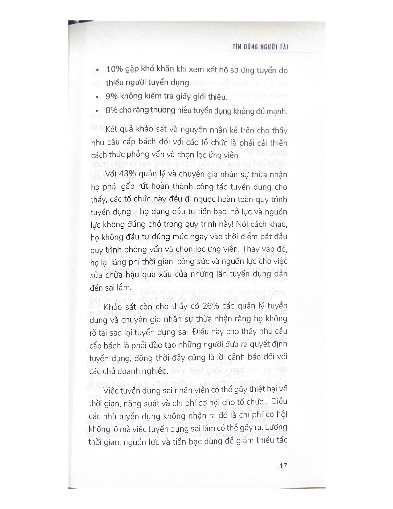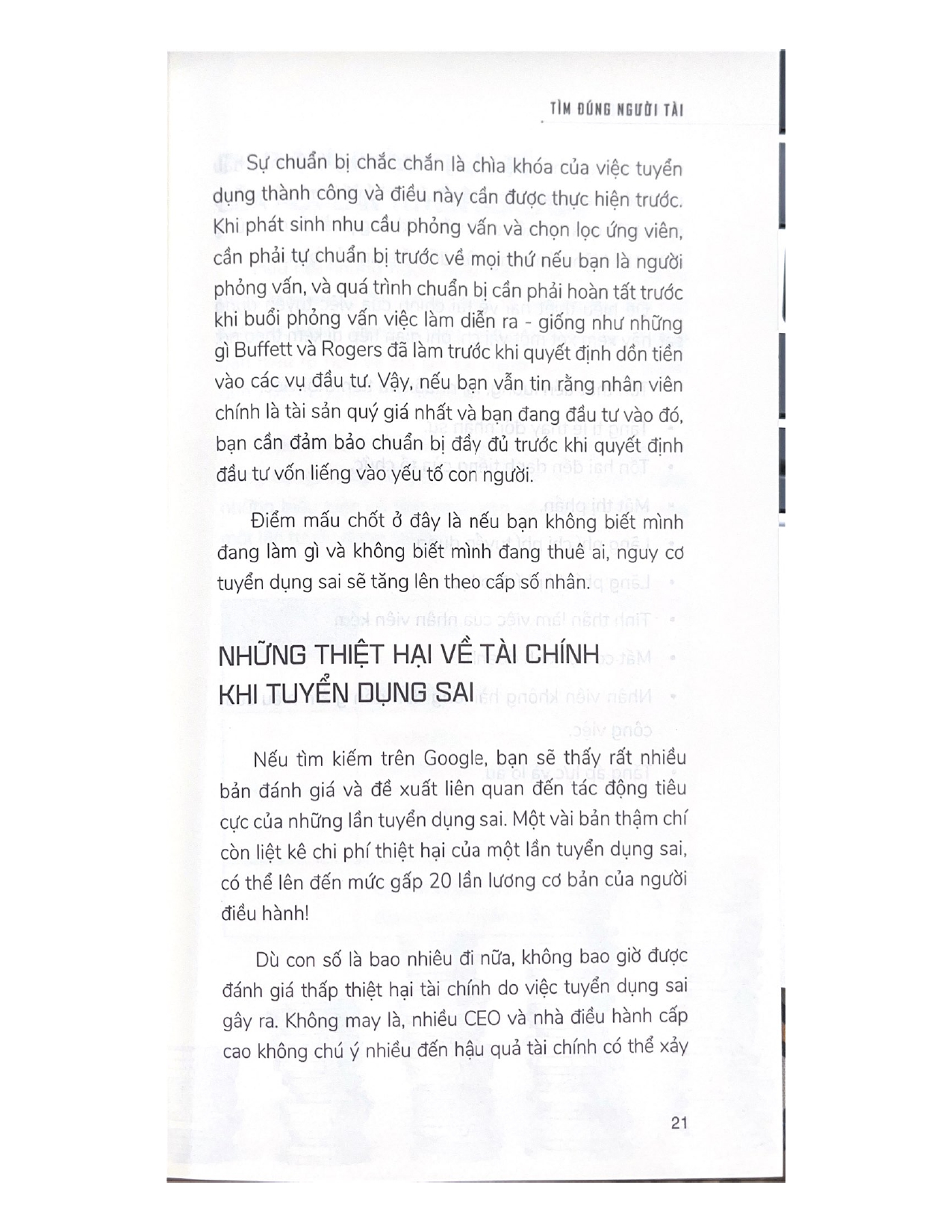 TÌM ĐÚNG NGƯỜI TÀI là bộ công cụ không thể thiếu trong việc quản lý nhân sự. Cuốn sách này được viết với mục đích giúp các chủ doanh nghiệp và nhà tuyển dụng, bao gồm CEO, giám đốc nhân sự (CHRO), giám đốc điều hành cấp cao, các chuyên gia nhân sự tránh được các sai lầm trong việc tuyển chọn người, nhằm nâng cao chất lượng tuyển dụng. Sách sẽ chuẩn bị cho bạn những tiêu chí, cách thức xây dựng cuộc phỏng vấn và quá trình phỏng vấn thông qua kỹ thuật đặt câu hỏi, kiểm tra giấy giới thiệu, và kể cả hẹn lịch phỏng vấn.