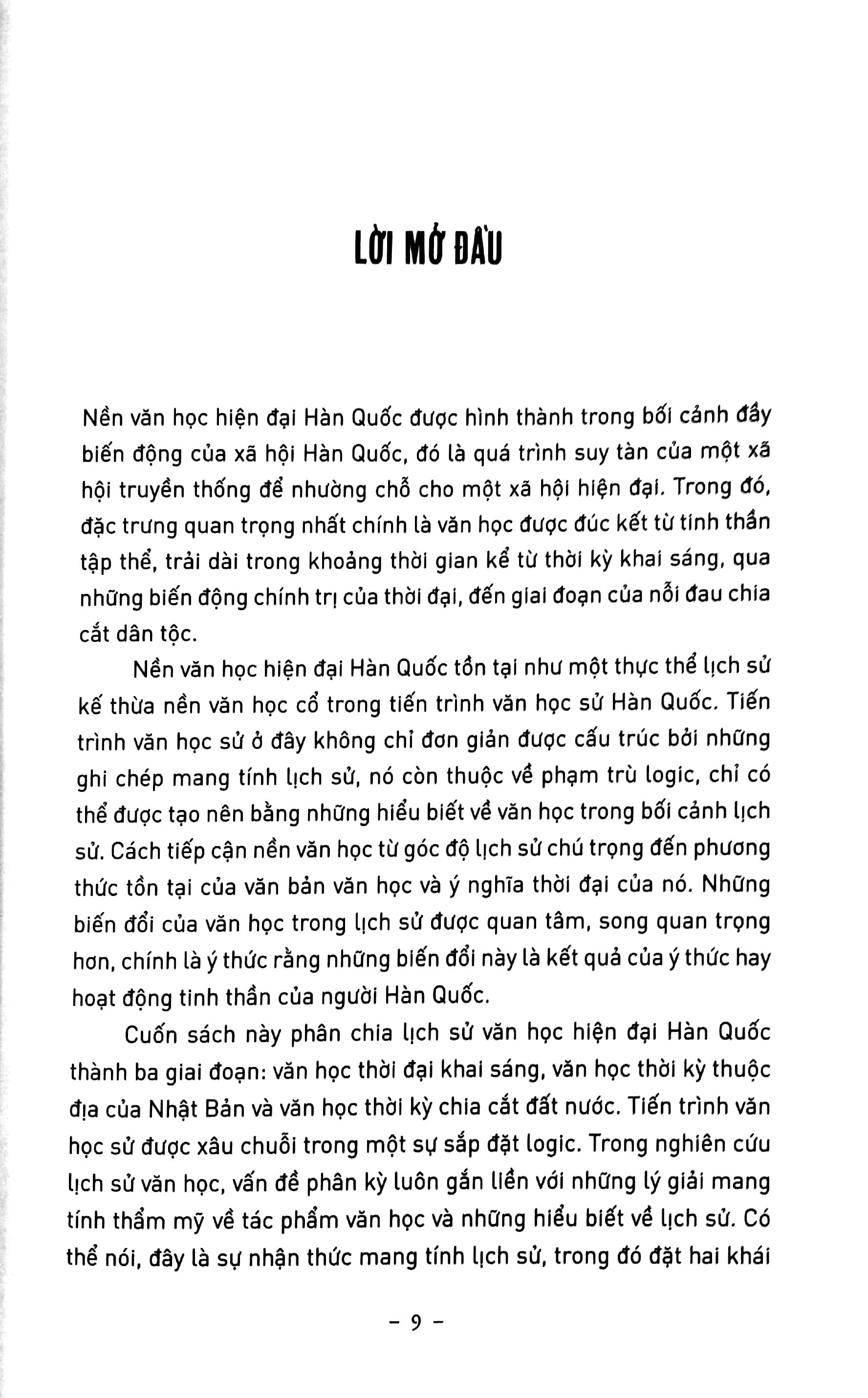 Văn học hiện đại Hàn Quốc tồn tại như một thực thể lịch sử kế thừa tinh hoa nền văn học cổ. Tiếp cận từ góc độ văn học sử, chú trọng đến phương thức tồn tại của văn bản văn học và ý nghĩa thời đại của nó. TÌM HIỂU VĂN HỌC HIỆN ĐẠI HÀN QUỐC là phiên bản tổng hợp một cách trọn vẹn dòng chảy của văn học hiện đại Hàn Quốc. Trên cả những kiến thức văn học thuần túy, cuốn sách đưa đến một bức tranh toàn cảnh về đất nước Hàn Quốc qua thời gian, bởi văn học chính là kết quả của ý thức và các hoạt động tinh thần con người.