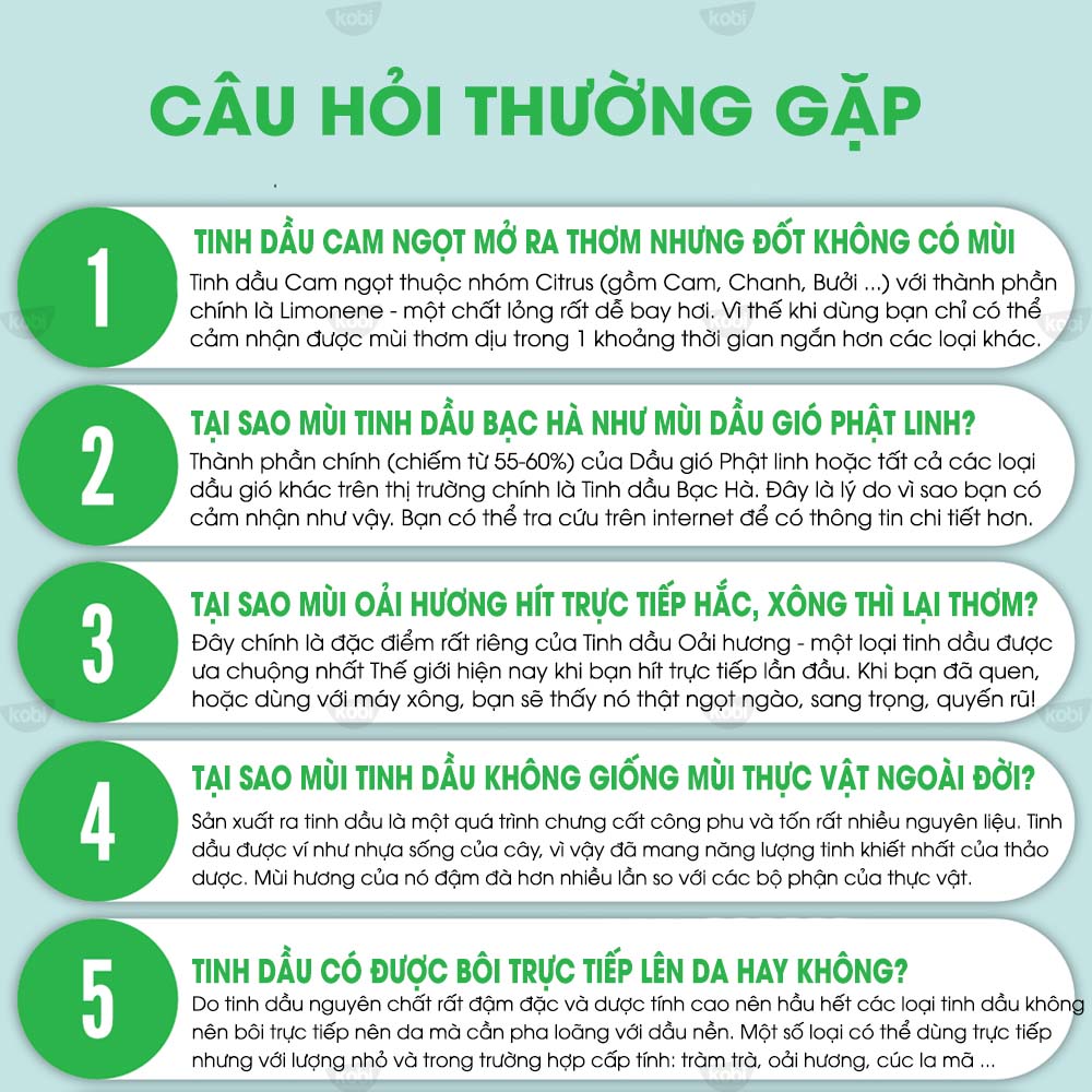 - Các dấu hiệu nhận biết tinh dầu nguyên chất? Những câu hỏi trên cứ lặp đi lặp lại trong suy nghĩ của bạn và hơn thế, bạn cần có được thông tin đầy đủ và chính xác nhất. Hãy cùng Kobi tìm hiểu bạn nhé! Tinh dầu là gì? Tinh dầu là một dạng chất lỏng chứa các hợp chất thơm dễ bay hơi được chiết xuất bằng cách chưng cất hơi nước hoặc ép lạnh, từ lá cây; thân cây; hoa; vỏ cây; rễ cây; hoặc những bộ phận khác của thực vật (wikipedia). Công dụng chính của tinh dầu? Với lịch sử phát triển hàng ngàn năm, tinh dầu được mệnh danh là báu vật của thiên nhiên, là tủ thuốc của tự nhiên được phát triển thành phương pháp trị liệu, chăm sóc sức khoẻ, làm đẹp trên toàn thế giới. … Một số công dụng chính có thể được liệt kê như sau: