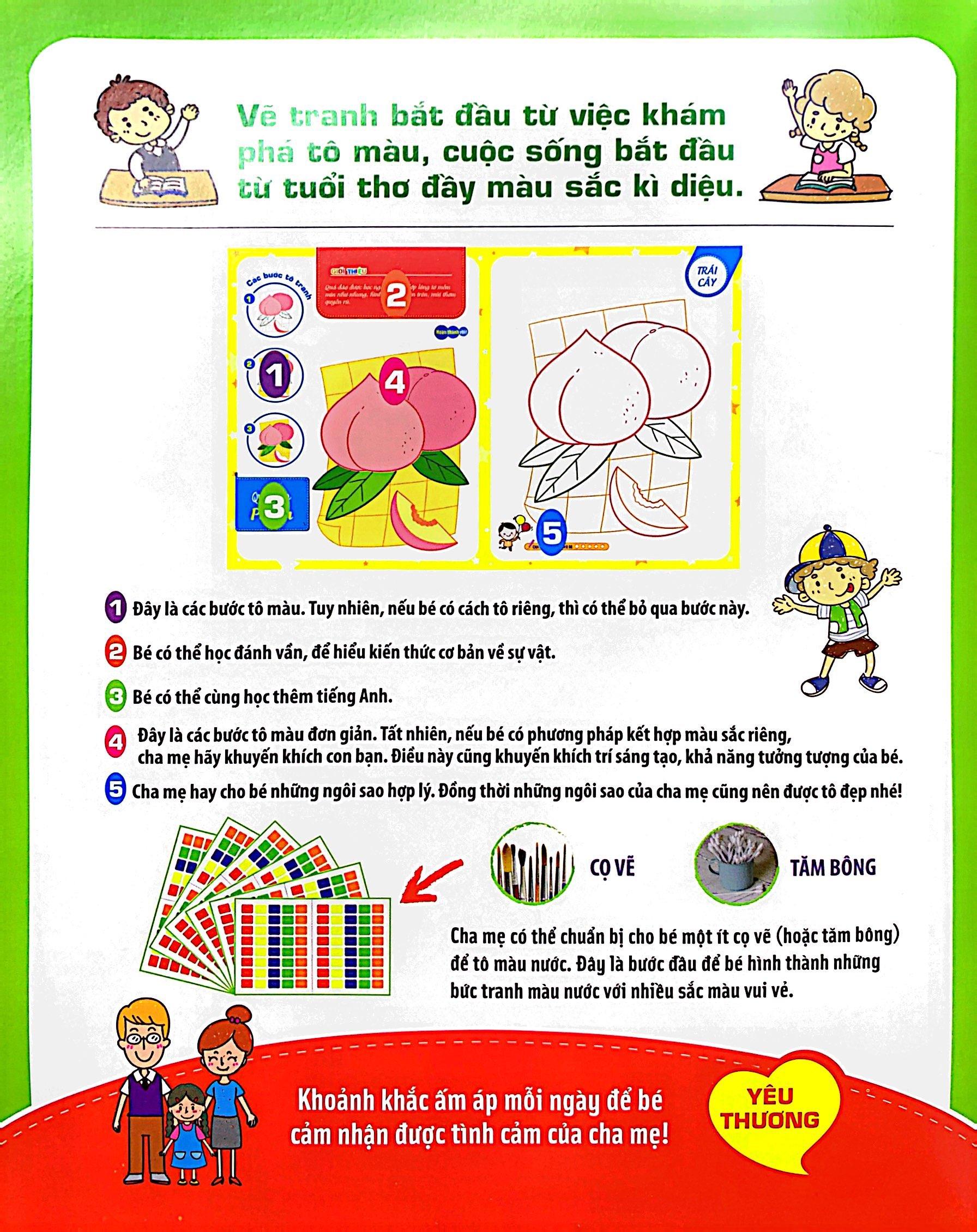 Sách tô màu, nhưng vẫn có vài dòng giới thiệu về sự vật, để bé có thể học đánh vần và hiểu kiến thức cơ bản của sự vật. Sự vật cũng được thể hiện bằng cả tên tiếng Việt và tiếng Anh giúp bé có thêm được vốn từ song ngữ phong phú về sự vật.