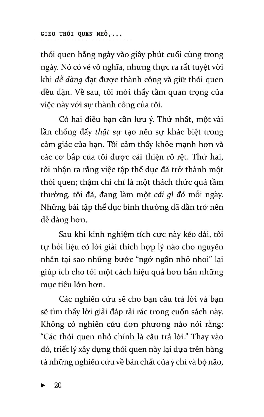 Mọi người thường nghĩ, chính họ là nguyên nhân khiến bản thân không thể đạt được sự thay đổi lâu dài. Nhưng vấn đề ở đây không phải là bản thân họ mà là chiến lược của họ. Bạn có thể đạt được những thành công to lớn mà không chịu bất cứ áp lực nào và sẽ không lặp lại thất bại nhờ những cách thức, phương pháp kiểu như: “lấy động lực”, sự kiên trì, và thậm chí là “làm đại đi”. Để đạt được những thay đổi lâu dài, bạn đừng cưỡng lại bộ não của mình. Khi bạn bắt đầu làm theo những chỉ thị của não bộ – theo dẫn dắt từ Gieo thói quen nhỏ gặt thành công lớn – thì những thay đổi tích cực, lâu dài sẽ không khó để đạt được! Gieo thói quen nhỏ gặt thành công lớn là cuốn sách khoa học tìm ra sự mâu thuẫn trong hầu hết các chiến lược phát triển bản thân và lý giải nguyên nhân tại sao các thói quen nhỏ lại tạo nên sự thống nhất rõ rệt. Một thói quen nhỏ là hành vi tích cực rất nhỏ mà bạn bắt bản thân phải làm mỗi ngày. Nó “quá nhỏ để thất bại” nhưng lại mạnh mẽ không thể lường trước và là một chiến lược góp phần hình thành nên thói quen ưu việt.Cuốn sách gồm có bảy phần chính. Ba phần đầu của cuốn sách bàn về việc xây dựng thói quen, bộ não, ý chí, động lực và chỉ ra cách chúng liên hệ với nhau. Hai phần tiếp theo bàn về các kết luận mang tính lô-gic và cách khai thác một cách khoa học nhất những thông tin cung cấp. Ba phần cuối hướng dẫn bạn áp dụng những cách thức đó trong cuộc sống.Chiến lược này sẽ giúp cuộc sống của bạn trở nên hoàn hảo hơn 99% số người sống trên hành tinh này.