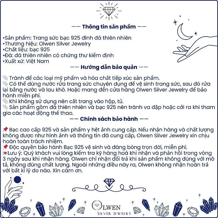 Tất cả những món trang sức của thương hiệu OlwenSilverJewelry đều được chế tác từ chất liệu bạc cao cấp nhập khẩu, đạt được những tiêu chuẩn chất lượng cao cùng với những công nghệ