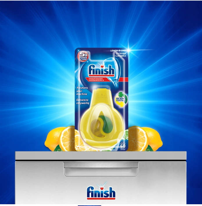 Chỉ cần treo Viên tạo mùi chanh Finish vào giỏ trên của máy rửa chén để nó không chặn cánh tay phun. Sau khoảng 60 lần giặt, thay thế máy làm mát không khí bằng một cái mới.