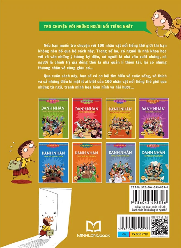 Nếu muốn tìm hiểu về 100 nhân vật nổi tiếng nhất trên thế giới, thì bạn không nên bỏ qua cuốn sách này. Các danh nhân trong ấn phẩm là những nhà khoa học lỗi lạc (Albert Einstein, Marie Cuire, Galileo, Newton, E), những nhà văn tài hoa (Hemingway, Conan Doyle, Cervantes, S), những họa sĩ tài danh (Van Gogh, Picasso, Leonardo da V), những chính trị gia kiệt xuất (Churchill, Gandhi, Washington, Peter Đại đế, Elizabeth đệ nhấ), những doanh nhân thành đạt (Ford, Warren Buffet, Walt Disney, Bill G), và rất nhiều danh nhân ở các lĩnh vực khác nữa.