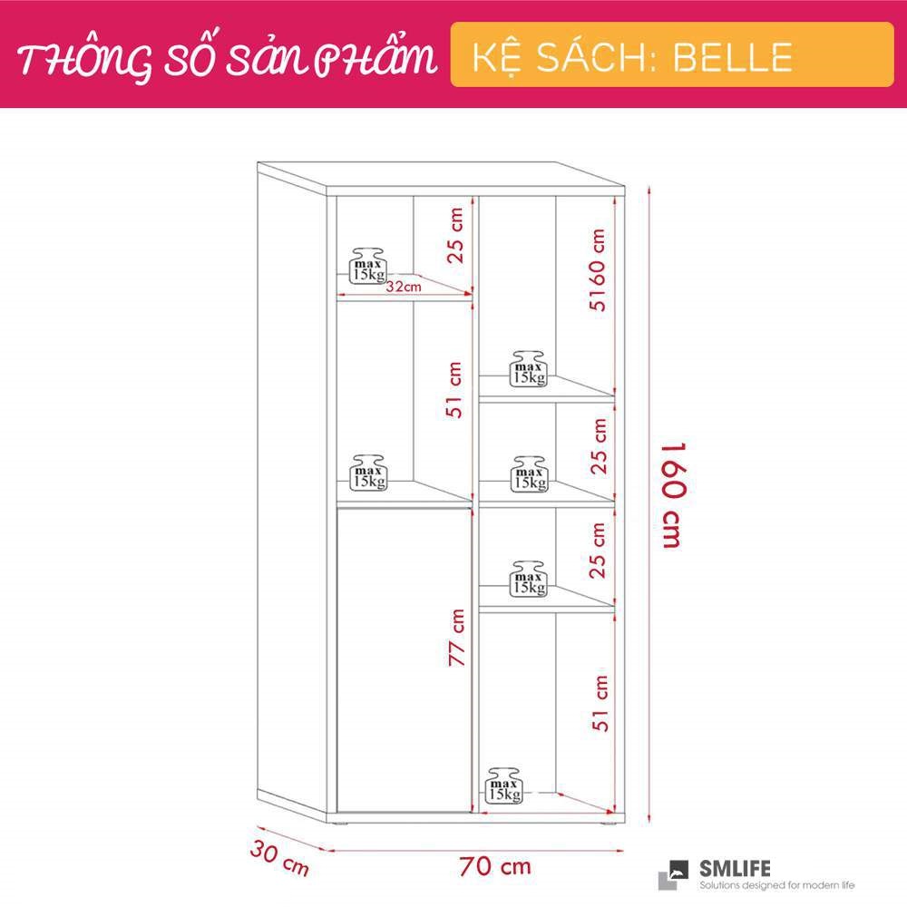 Kệ sách Belle được ví như một tác phẩm nghệ thuật với phong cách đơn giản sẽ giúp bạn xắp sếp những cuốn sách một cách sành điệu và độc đáo. Kệ sách Belle mang đến sự tinh tế, hiện đại cho phòng khách của bạn và đồng thời cung cấp một không gian lớn cho các vật dụng trang trí. Sản phẩm phù hợp cho mọi phong cách trang trí căn hộ và văn phòng làm việc. Sử dụng vật liệu ván ép công nghiệp MDF chống ẩm phủ Melamine cao cấp giúp kệ sách SMLIFE có độ bền cao, chống trầy và chống ẩm rất tốt. Bạn có thể tự lắp đặt sản phẩm dễ dàng với các phụ kiện và hướng dẫn đi kèm.