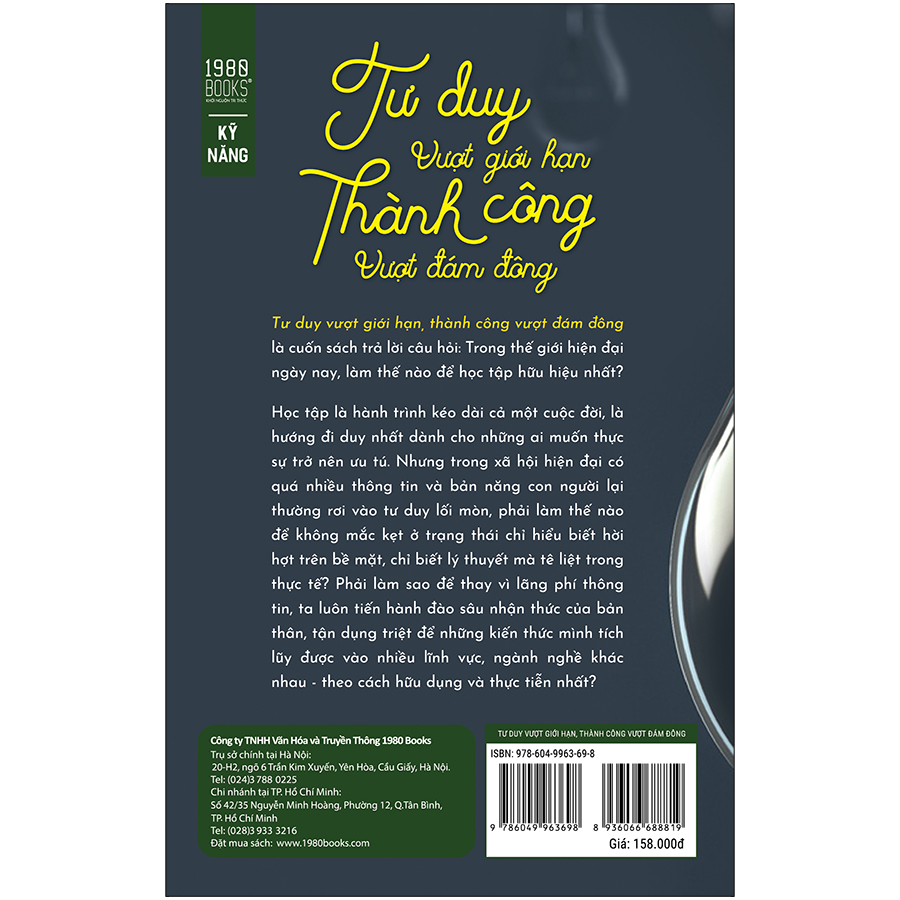 Trong thế giới hiện đại ngày nay, làm thế nào để học tập hữu hiệu nhất? Song song với khối lượng tri thức khổng lồ được sản sinh mỗi ngày khiến con người bị nhiễu loạn thông tin, bản thân mỗi cá nhân chúng ta cũng rất dễ hình thành những kiểu suy nghĩ rập khuôn, định kiến, đi vào lối mòn tư duy, làm cản trở quá trình khám phá các hiện tượng, sự vật một cách sâu sắc. Học tập là hành trình kéo dài cả một cuộc đời, là hướng đi duy nhất dành cho những ai muốn thực sự trở nên ưu tú. “Tư duy vượt giới hạn, thành công vượt đám đông” là cuốn sách trả lời câu hỏi đó. Vậy làm thế nào để không mắc kẹt ở trạng thái hiểu biết hời hợt trên bề mặt, biết rộng mà chẳng biết sâu, chỉ biết lý thuyết mà tê liệt trong thực tế? Phải làm sao để thay vì lãng phí thông tin, ta luôn tiến hành đào sâu nhận thức của bản thân đối với mỗi vấn đề, tận dụng triệt để những kiến thức mình tích lũy được vào nhiều lĩnh vực, ngành nghề khác nhau - theo cách hữu dụng và thực tiễn nhất?