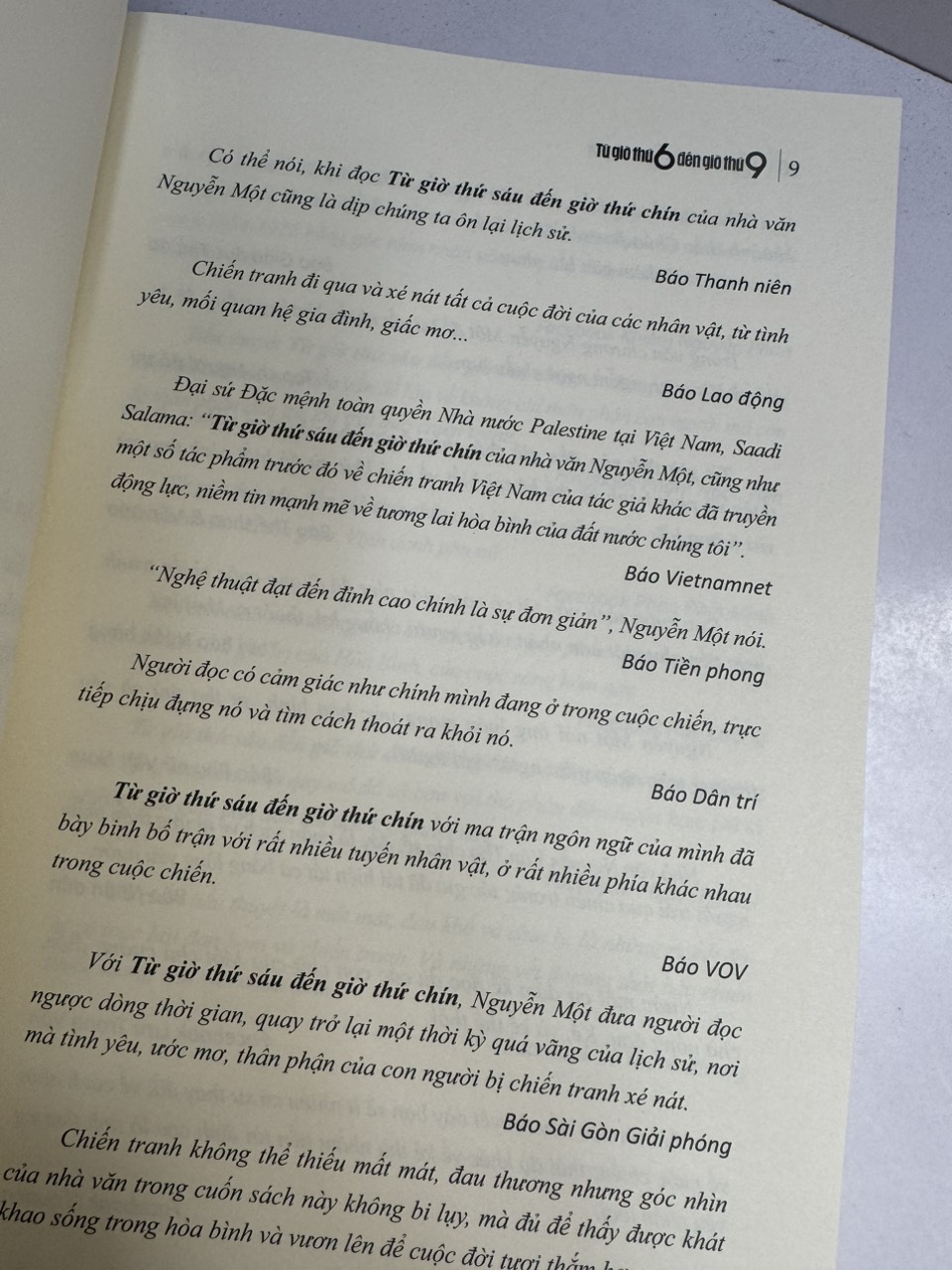… Từ giớ thứ sáu đến giờ thứ chín là cuốn tiểu thuyết đa chủ đề, Quê hương – Chiến tranh – Tôn giáo…, những chủ đề này được ngào trộn, tương tác, phản ứng và kết tinh nhờ một chất xúc tác kì diệu là Tình yêu.