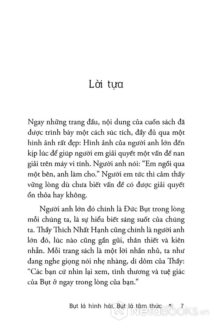 Ngay những trang đầu, nội dung của cuốn sách đã được trình bày một cách súc tích, đầy đủ qua một hình ảnh rất đẹp: Hình ảnh của người anh lớn đến kịp lúc để giúp người em giải quyết một vấn đề nan giải trên máy vi tính. Người anh nói: “Em ngồi qua một bên, anh làm cho.” Người em tức thì cảm thấy vững lòng dù chưa biết vấn đề có được giải quyết ổn thỏa hay không. Người anh lớn đó chính là Đức Bụt trong lòng mỗi chúng ta, là sự hiểu biết sáng suốt của chúng ta. Thầy Thích Nhất Hạnh cũng chính là người anh lớn đó, lúc nào cũng gần gũi, thân thiết và kiên nhẫn. Mỗi trang sách là một lời nhắn nhủ, ta như đang nghe giọng nói nhẹ nhàng, dí dỏm của Thầy: “Các bạn cứ nhìn lại xem, tình thương và tuệ giác của Bụt ở ngay trong lòng của bạn.”