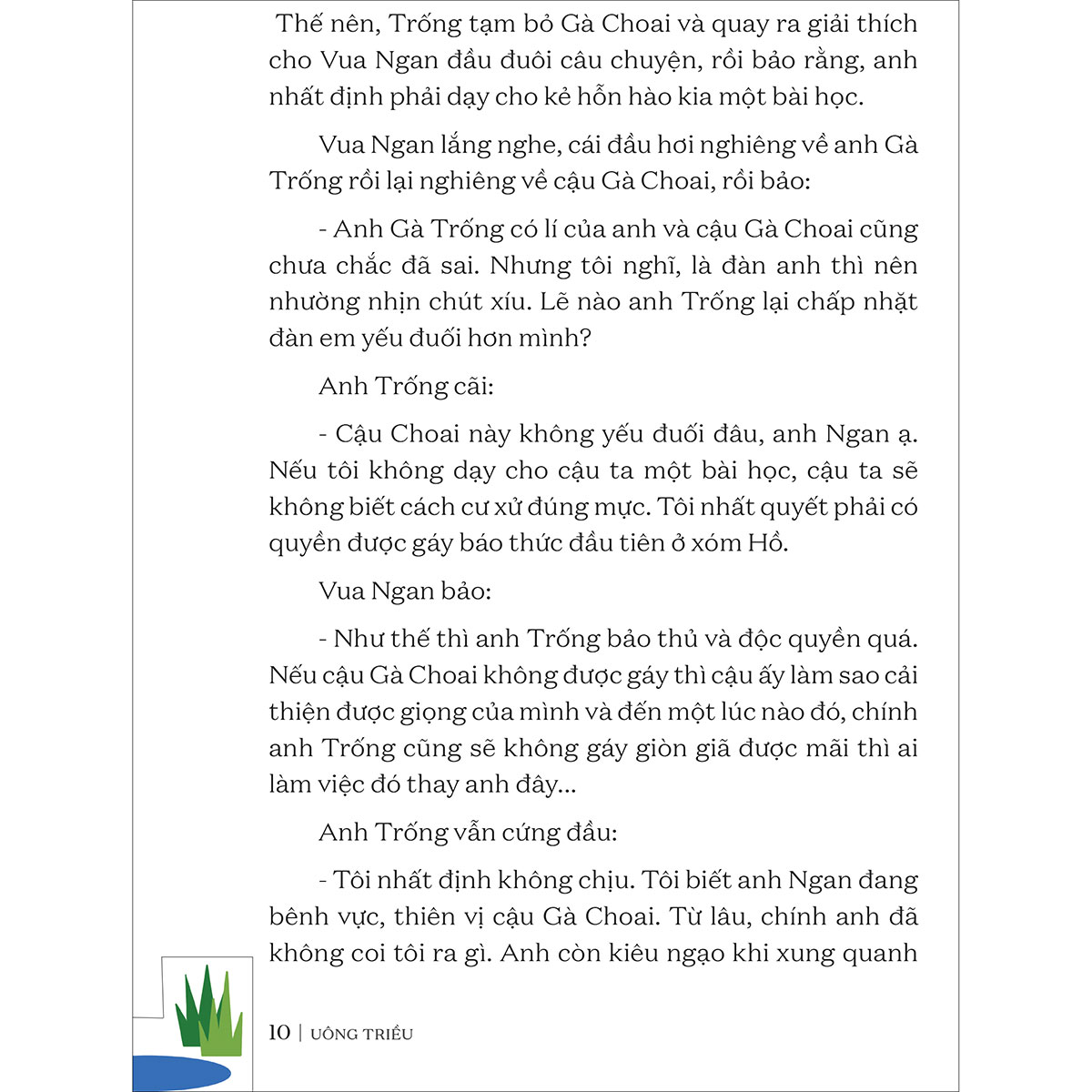 “Tưởng như Vua Ngan xóm Hồ với những kì vọng giáo dục của tác giả sẽ khiến truyện đọc trở nên nặng nề. Nhưng không, Uông Triều đã có cách trình hiện thông điệp phù hợp, khéo léo. Không trực diện, khiên cưỡng, các bài học đạo đức được hiển lộ từ diễn biến của tình huống truyện với giọng văn hài hước, mềm mại, và dễ chịu. Trong đó, tác giả chú trọng đến yếu tố thoại, mô tả hành động thay vì suy nghĩ của nhân vật.”