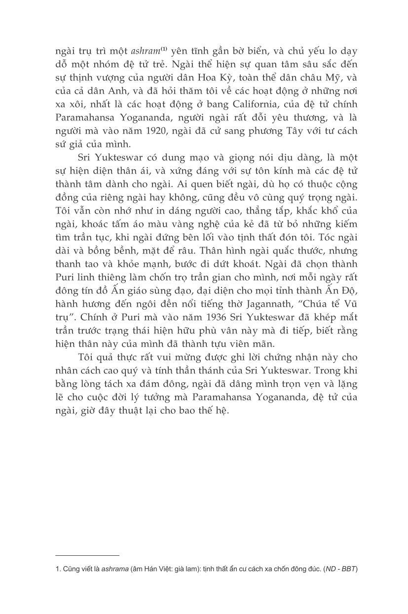 “Yogananda đã trình bày tường tận cái gọi là các giáo lý bí truyền Đông phương với sự chân thật vô cùng và khiếu hài hước xuất sắc. Cuốn sách của ngài thật đáng đọc vì là câu chuyện về một cuộc đời ngập trong hành trình tâm linh.” - United Press