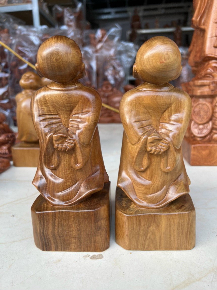 _ Tượng chú tiểu ,tùy duyên được trạm khắc tỉ mỉ tinh sảo kỳ công .Đi hầu hết tất cả mọi chi tiết góc ngách của tượng đều được ngọt tỉa chỉnh sửa hoàn toàn bằng tay thủ công .Đồng thời tượng được kiểm định kỹ lưỡng như cho vào thẩm sấy cho gỗ khô kiệt .Mục đích trống dập nứt vênh mo mối mọt .Kết hợp với trà nhám đánh giấy giáp nhiều nước cho sạch sẽ sờ mát lạnh rồi cho vào phun lót ,Làm bóng mờ để giữ lại mầu sắc vân gỗ tự nhiên .Tượng được làm và hoàn thiện do bàn tay khối óc tài hoa ,TỪ những người thợ giàu kinh nghiệm cũng như tay nghề cao trong làng nghề truyền thống .Chính vì thế tượng tùy duyên đã đáp ứng đầy đủ những tiêu trí ( Đẹp bền rẻ ) Thẩm mỹ nghệ thuật với chất lượng tuyệt vời .
