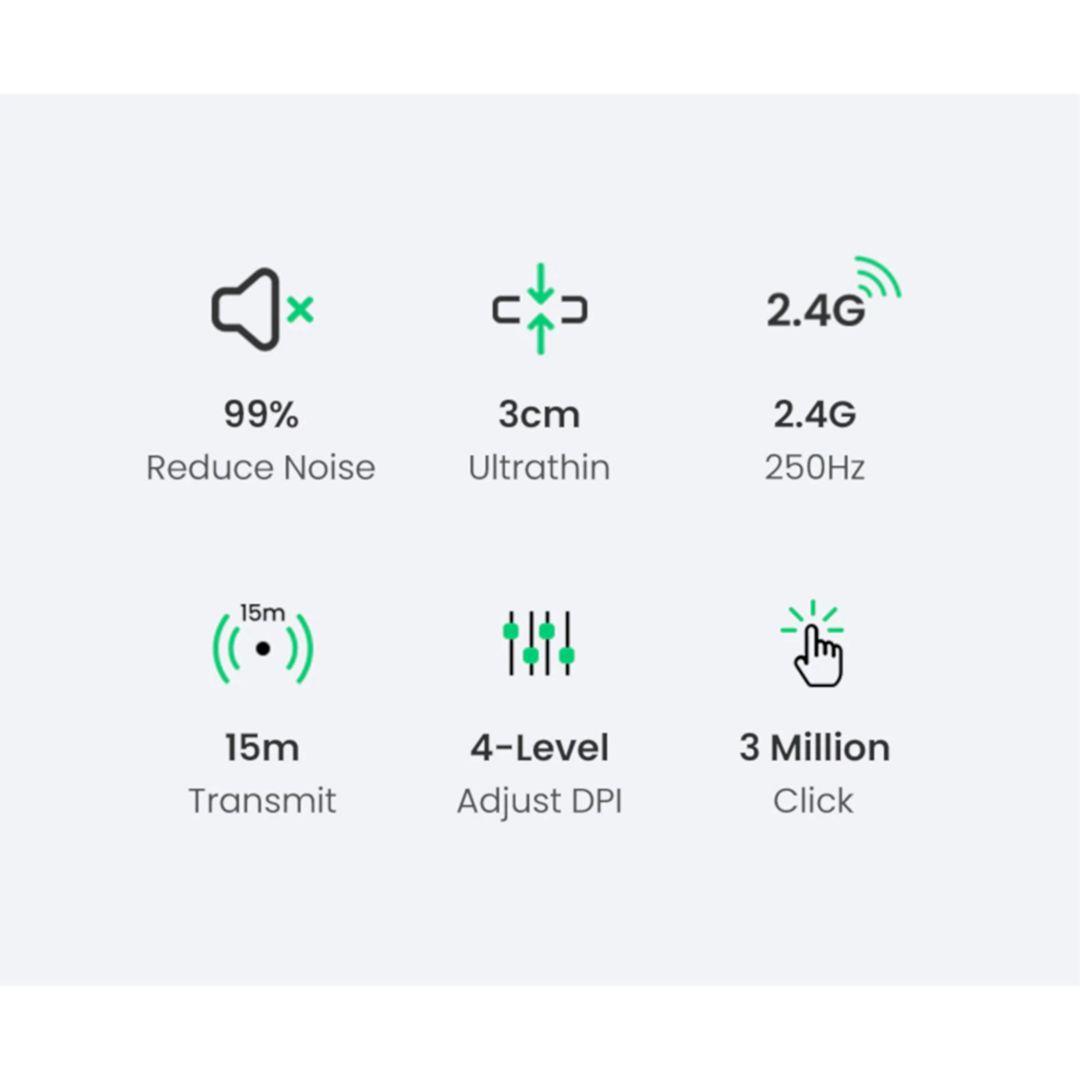 1. Brand: Ugreen 2. Model: MU006 3. Mouse type : wireless 4. Sensor type : optical 5. Button lifetime : approx. 3 million clicks 6. Mouse sensitivity : 1000/1600/2000/4000 DPI 7. Noise level : ≤