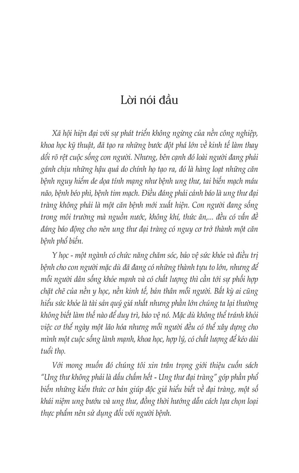 Bộ sách Ung thư không phải là dấu chấm hết gồm 5 quyển. Mỗi quyển là một sự tìm hiểu mỗi chứng bệnh ung thư khác nhau: Gan, Phổi, Thực quản, Đại tràng, tuyến vú; cung cấp những kiến thức cơ bản cần thiết nhằm giúp chúng ta chủ động phòng chống và chiến thắng bệnh tật. Ung thư đại tràng giúp chúng ta hiểu biết về đại tràng, một số khái niệm ung bướu và ung thư, cách chẩn đoán xác định bệnh ung thư đại tràng, những hướng điều trị bệnh, đồng thời đưa ra chế độ dinh dưỡng, cách lựa chọn loại thực phẩm nên sử dụng đối với người bệnh,…