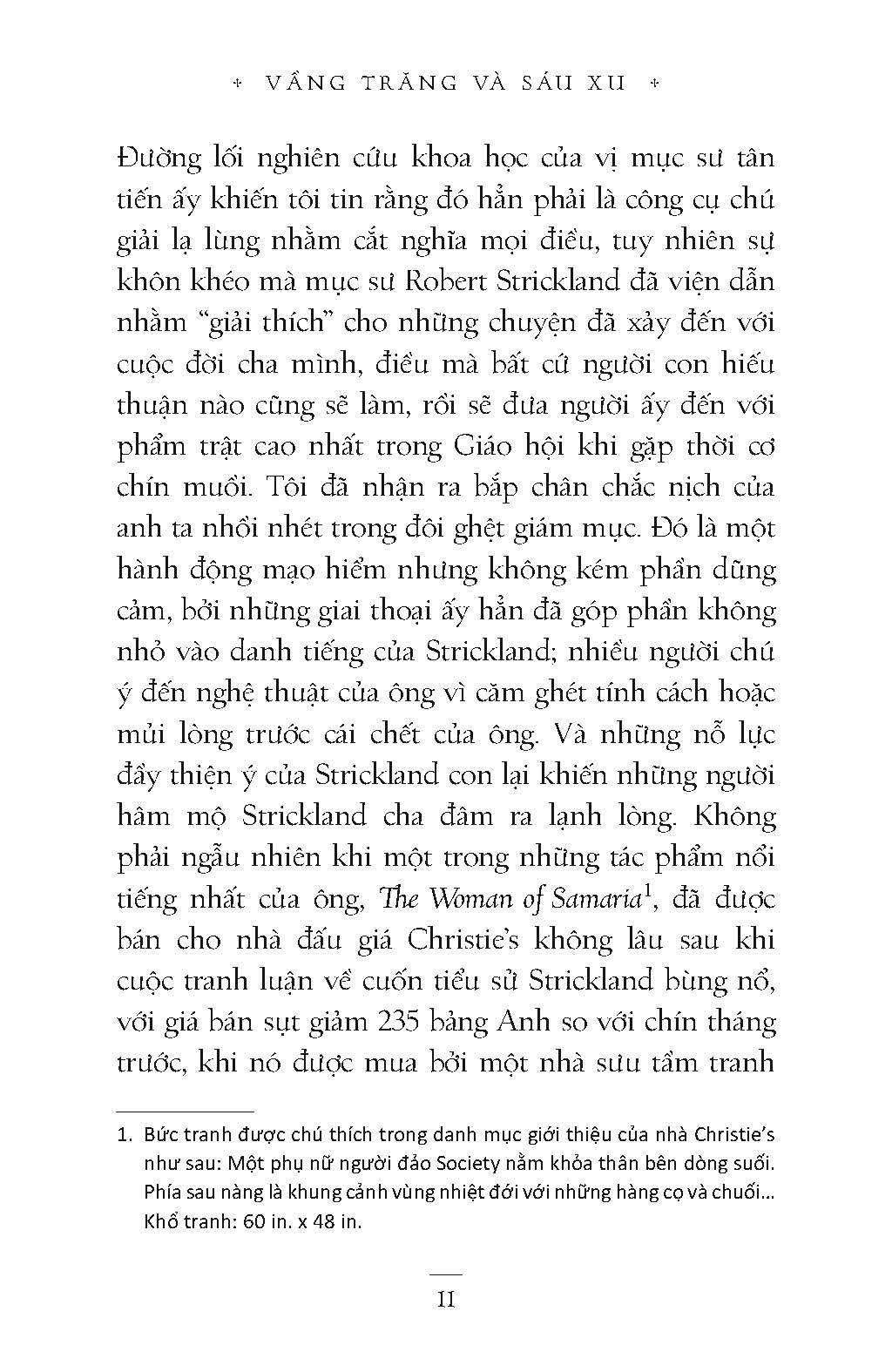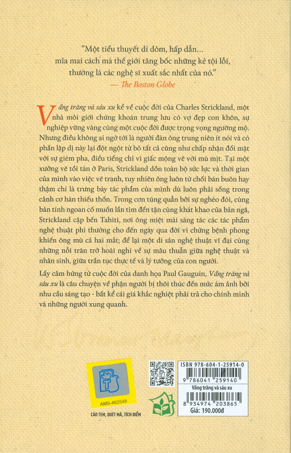 Vầng trăng và sáu xu” kể về cuộc đời của Charles Strickland, một nhà môi giới chứng khoán trung lưu có vợ đẹp con khôn, sự nghiệp vững vàng cùng một cuộc đời được trọng vọng ngưỡng mộ. Nhưng điều không ai ngờ tới là người đàn ông trung niên ít nói và có phần lập dị này lại đột ngột từ bỏ tất cả cũng như chấp nhận đối mặt với sự gièm pha, điều tiếng chỉ vì giấc mộng vẽ vời mù mịt. Tại một xưởng vẽ tồi tàn ở Paris, Strickland dồn toàn bộ sức lực và thời gian của mình vào việc vẽ tranh, tuy nhiên ông luôn từ chối bán buôn hay thậm chí là trưng bày tác phẩm của mình dù luôn phải sống trong cảnh cơ hàn thiếu thốn. Trong cơn túng quẫn bởi sự nghèo đói, cùng bản tính ngoan cố muốn lần tìm đến tận cùng khát khao của bản ngã, Strickland cập bến Tahiti, nơi ông miệt mài sáng tác các tác phẩm nghệ thuật phi thường cho đến ngày qua đời vì chứng bệnh phong khiến ông mù cả hai mắt; để lại một di sản nghệ thuật vĩ đại cùng những nỗi trăn trở hoài nghi về sự mâu thuẫn giữa nghệ thuật và nhân sinh, giữa trần tục thực tế và lý tưởng của con người. Lấy cảm hứng từ cuộc đời của danh họa Paul Gauguin, “Vầng trăng và sáu xu” là câu chuyện về phận người bị thôi thúc đến mức ám ảnh bởi nhu cầu sáng tạo - bất kể cái giá khắc nghiệt phải trả cho chính mình và những người xung quanh.