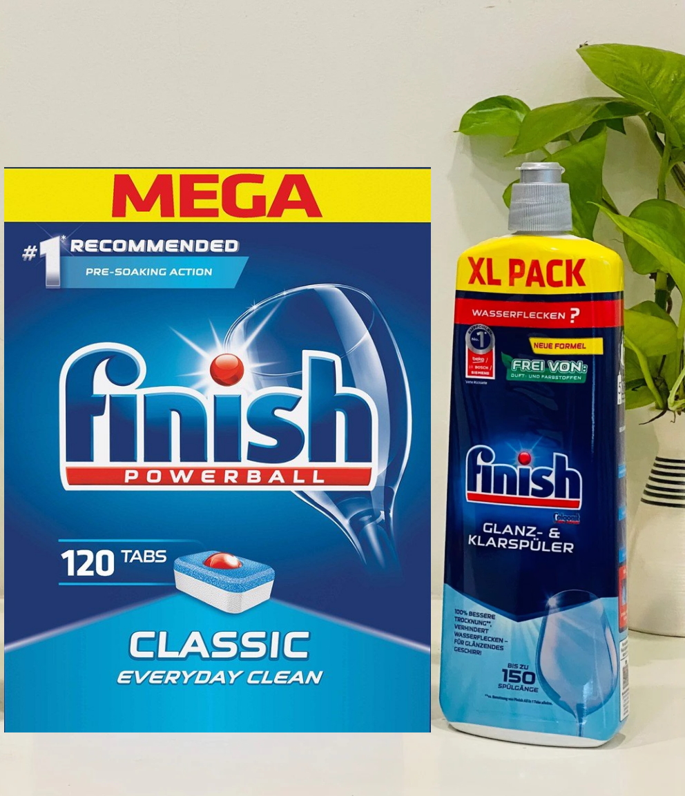 Combo: Viên rửa Finish 120 viên + Nước làm bóng Finish 800ml Chuyên dùng cho máy rửa bát chén Giúp bát đĩa nhà bạn sạch hơn, nhanh khô hơn và bóng sáng hơn