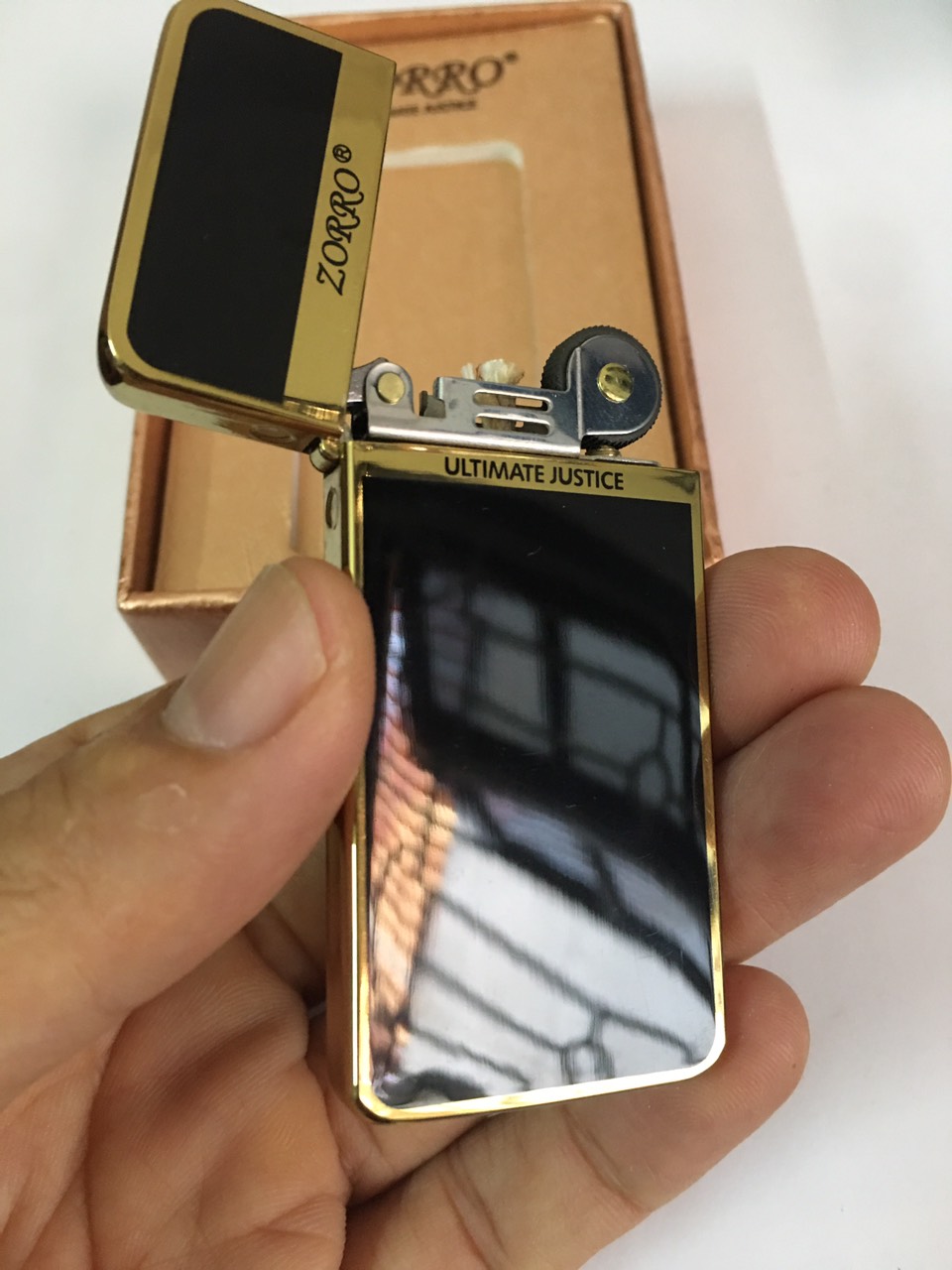 BẬT LỬA ZORRO ZC5 SƠN MÀI BÓNG VIỀN VÀNG CAO CẤP MÔ TẢ SẢN PHẨM : -Chất liệu: hợp kim nguyên khối -Màu sắc : bên trong sơn mài đen bóng + viền vàng -Dùng N/L : x_ăng -Phụ kiện: dùng chung như ZIP/PO -Kích thước : 69mm x 33mm x 6mm