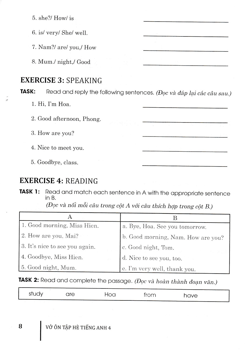 Mỗi Exercise được phân chia thành nhiều bài tập nhỏ sẽ giúp các em dễ dàng ôn tập và thực hành các từ vựng, mẫu câu, cũng như ôn luyện đầy đủ 4 kĩ năng nghe, nói, đọc và viết tiếng Anh.