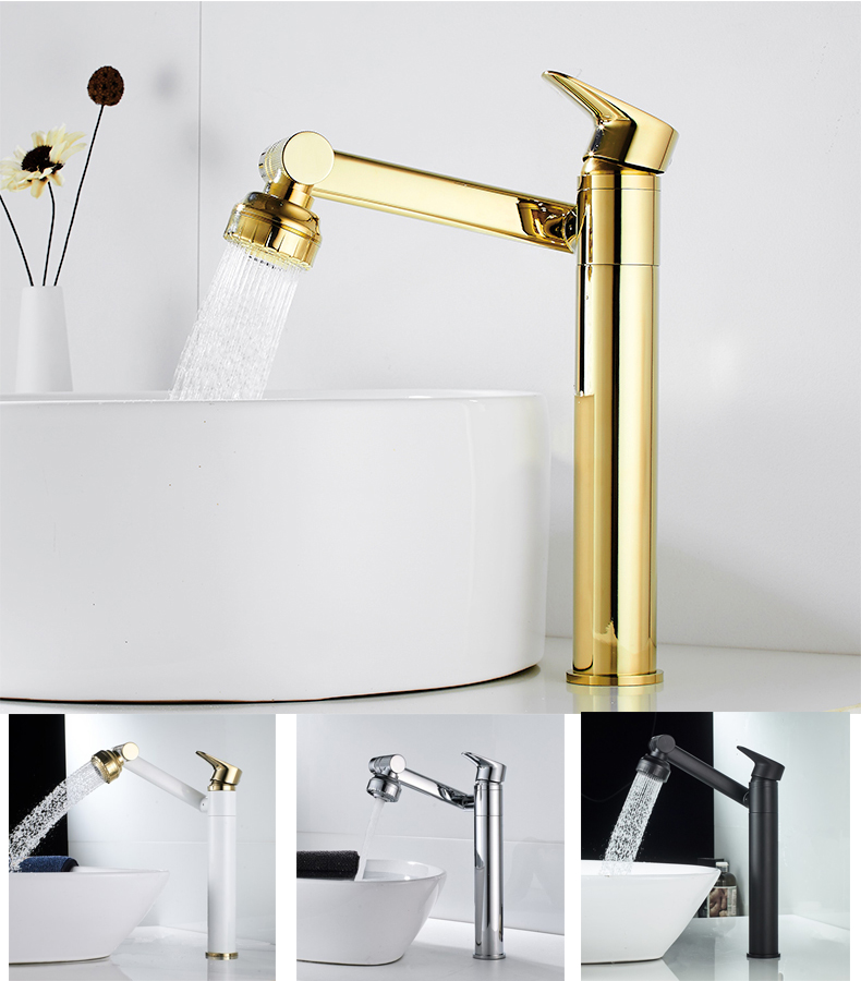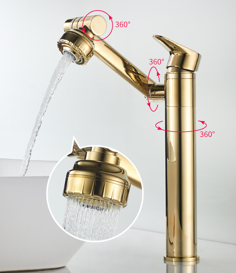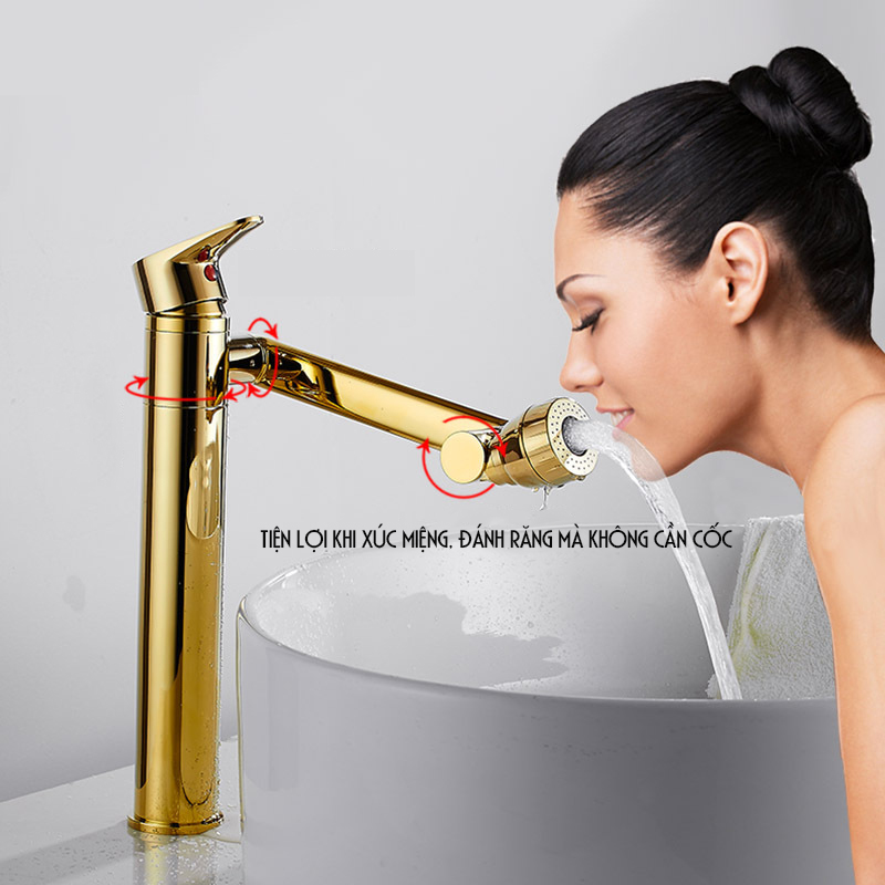 Vòi rửa mặt Lavabo cổ xoay 720 độ đa chiều, củ đồng, thân cao, mạ vàng, điều chỉnh nhiều chế độ tia nước Minh House