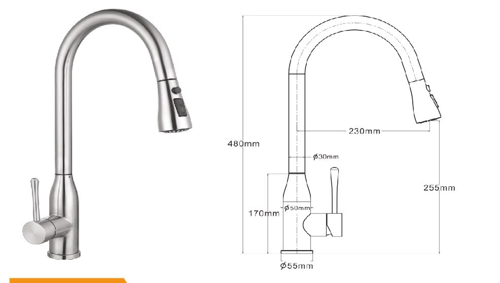 Vòi rút dây cổ hình bầu dục nóng lạnh inox Tundo BR6220B Boss 480*55*255 mm Chức năng vòi rút dây, có 2 đường nước nóng lạnh, hệ thống nước chảy hoa sen và tạo bọt