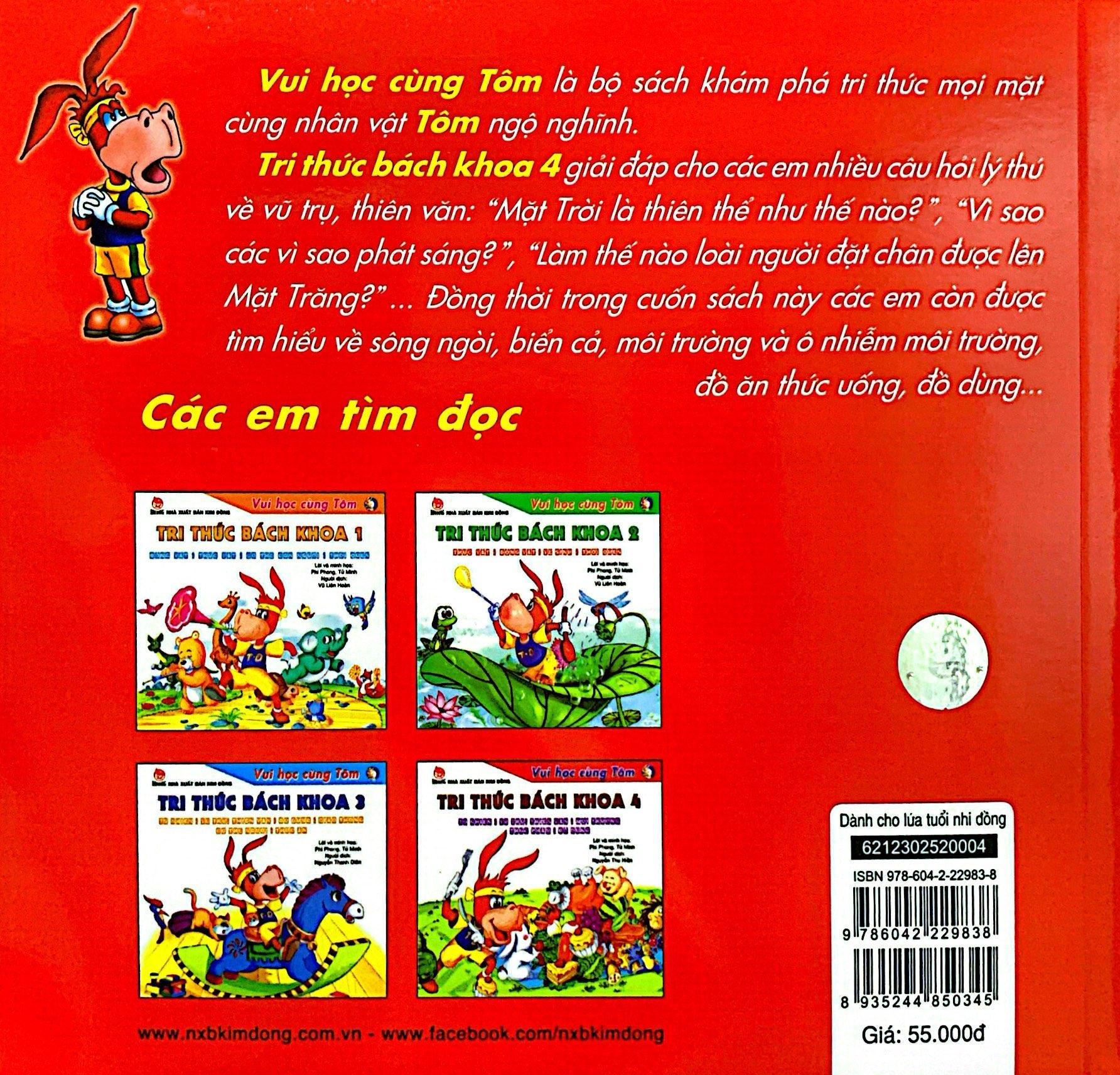 Tri thức bách khoa 4 giải đáp cho các em nhiều câu hỏi lý thú về vũ trụ, thiên văn: “Mặt trời là thiên thể như thế nào?”, “Vì sao các vì sao phát sáng?”, “Làm thế nào loài người đặt chân được lên Mặt Trăng?”… Đồng thời trong cuốn này các em còn được tìm hiều về sông ngòi, biển cả, môi trường và ô nhiễm môi trường, đồ ăn thức uống, đồ dùng…