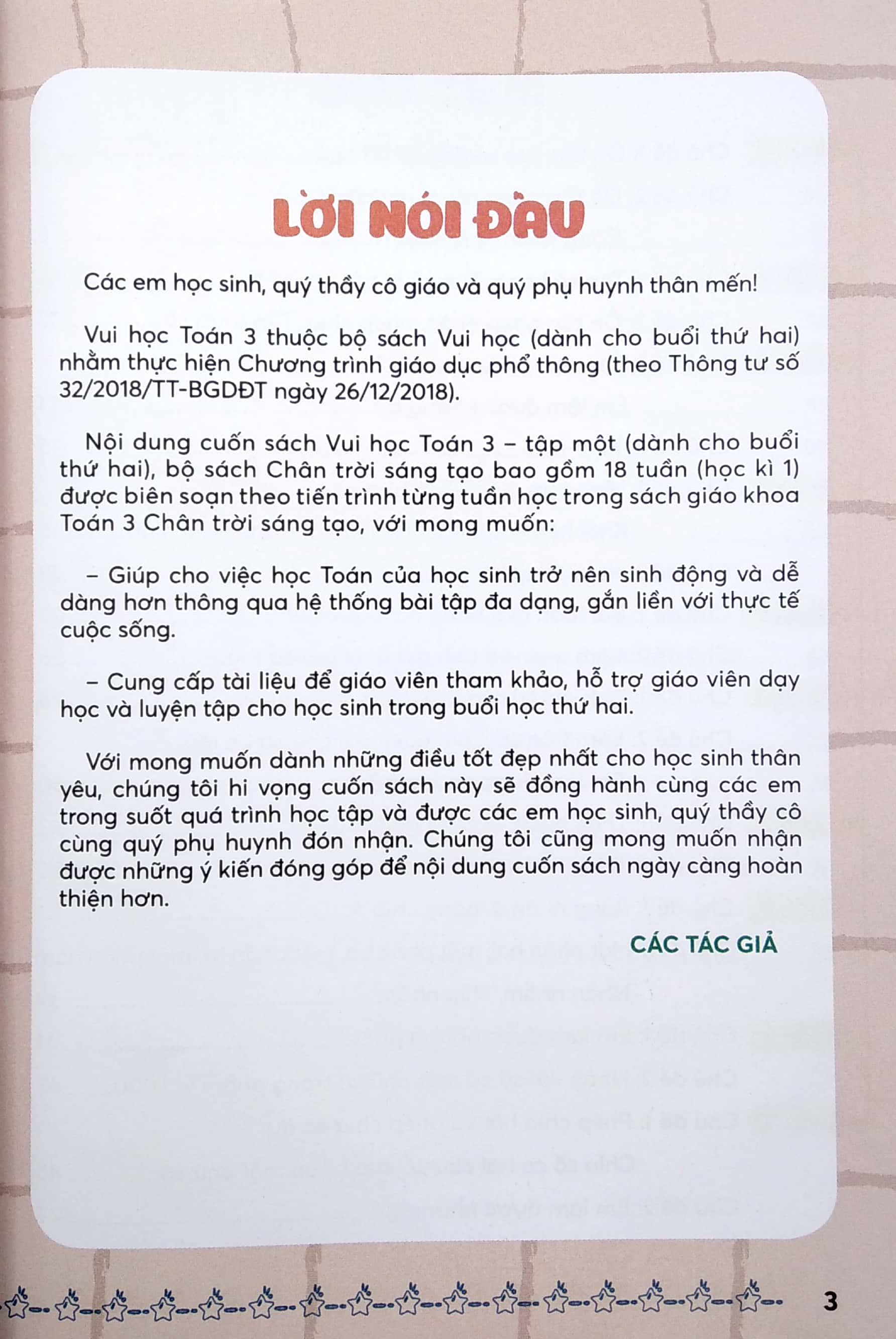 Vui học Toán 3 thuộc bộ sách Vui học (dành cho buổi thứ hai) nhằm thực hiện Chương trình giáo dục phổ thông (theo Thông tư số 32/2018/TT-BGDĐT ngày 26/12/2018).