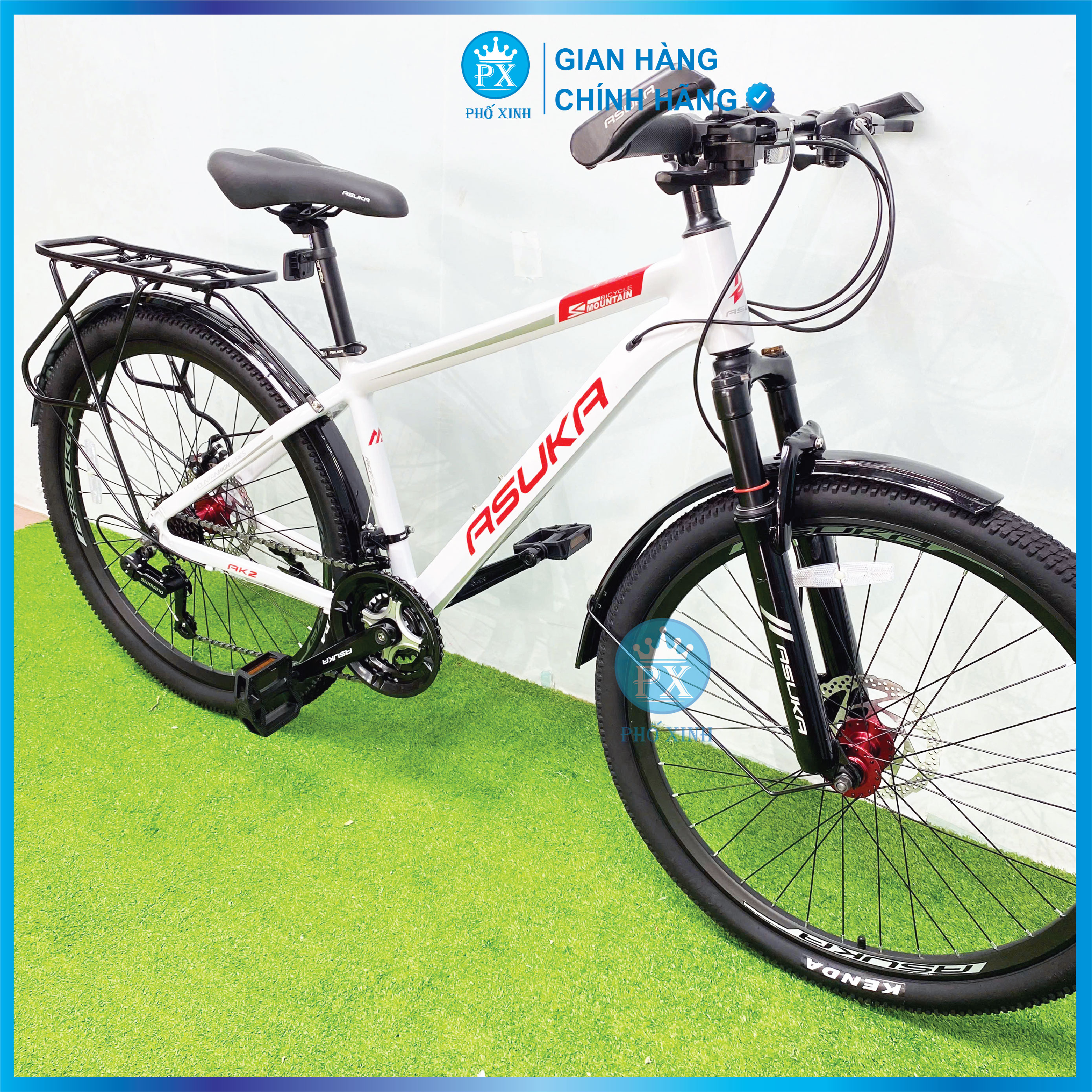 XE ĐẠP ĐỊA HÌNH ASUKA BÁNH 26 inch KHUNG NHÔM ( mẫu mới) ️ Khung: Nhôm ALu ️ Càng/Phuộc: Giảm xóc , có khoá hành trình tuỳ chỉnh ️ Tay đề: S H I M A N O 3*7 ( 21 tốc độ) ️ Gạt đĩa: S H I M A N O TOURNEY ️ Củ đề: S H I M A N O TOURNEY ️ Trục giữa: bạc đạn ️ Phanh: Phanh đĩa cơ nhôm ️ Vành: Nhôm 2 lớp ️ Mayer: nhôm ️ Tay lái/Ghi-đông: thép ️ Pô-tăng: Nhôm ️ Cọc yên: Nhôm ️ Lốp : K E N D A 26